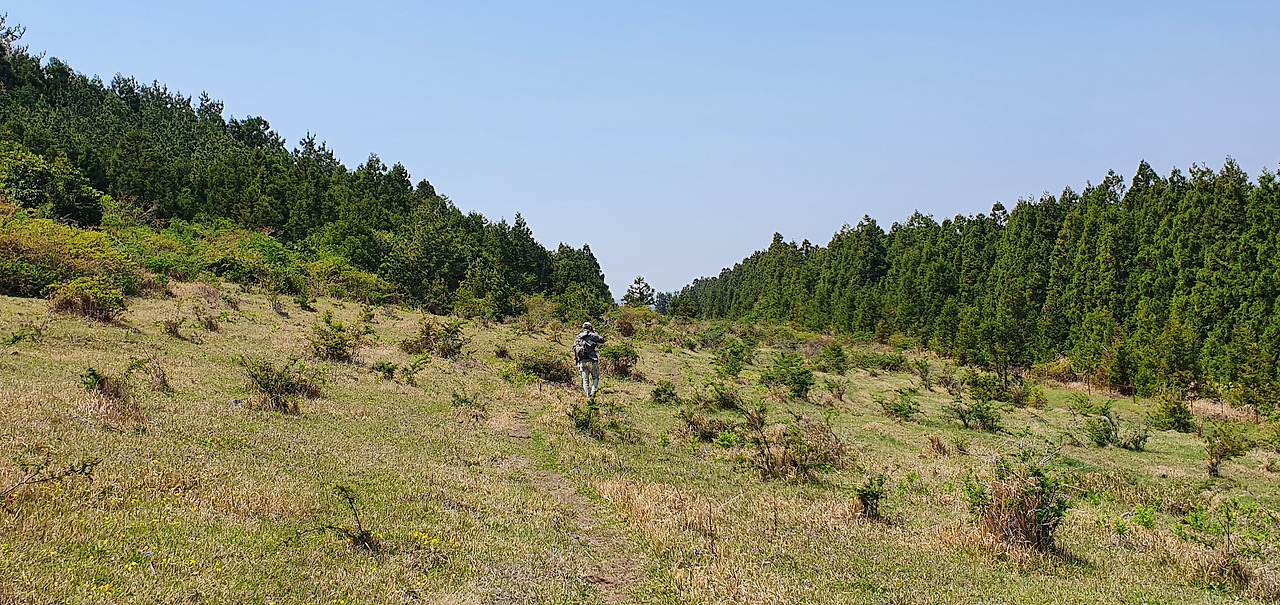 끝없이 펼쳐질 듯한 길을 걷다 갑자기 이 길의 끝을 알리는 문이 나타난다. 그리고 좁은 문을 통과하니 또 다른 모습을 보여준다. 오름은 살아있다. 이제 영주산의 뒤로 들어간다. 길은 조금씩 거칠어지고 조용하다. 길은 삼나무 편백숲으로 이어진다.