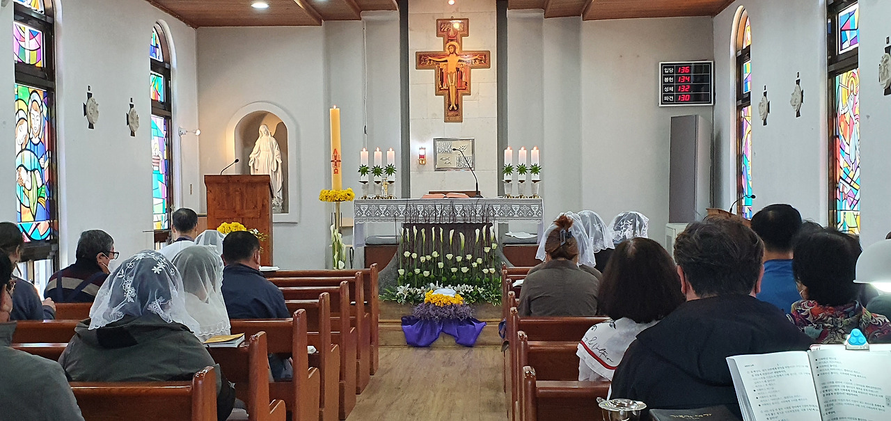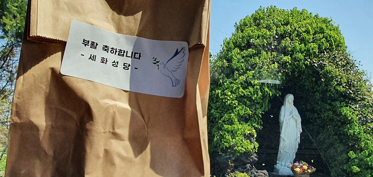 작은 성당이 좋다. 지난번 미사 때도 30명쯤으로 가득 차 보이는 성당이다. 성당 입구, 책상 위에 부활 축하라고 쓰여있는 갈색 봉투가 차곡차곡 줄 서있다. 미사가 시작되고 오르간이 울리고 신부님이 성당 입구로 들어오신다. 나는 맨 뒷자리에 앉았다. 부활 선물로 받은 갈색 봉투 안에 계란 세알, 초록 쑥떡, 두유 하나가 있다.