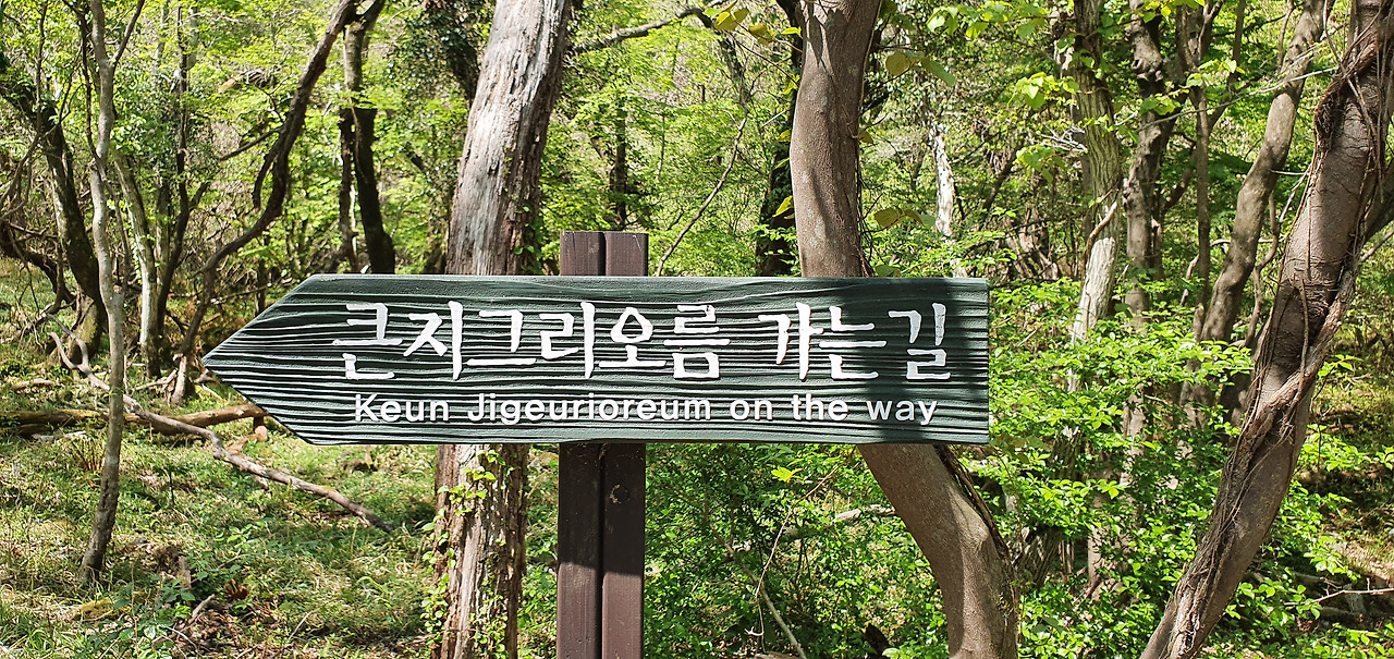 숲을 걷고 걷다 보면 갑자기 하늘 높이 뻗은 편백나무 숲이 펼쳐진다. 편백나무 숲을 통과해 정상으로 오르는 가파른 계단을 오르면 널찍한 데크의 전망대가 기다리고 있다.숨을 고르고 주위를 둘러본다.오름들과 어우러진 위풍당당한 한라산에서 시선이 아래로 내려가면 교래 곶자왈의 숲이 한없이 펼쳐진다. 큰지그리오름 정상에서 곶자왈을 바라보며 다시 편백나무 숲으로 그리고 초록의 곶자왈로 내려간다.