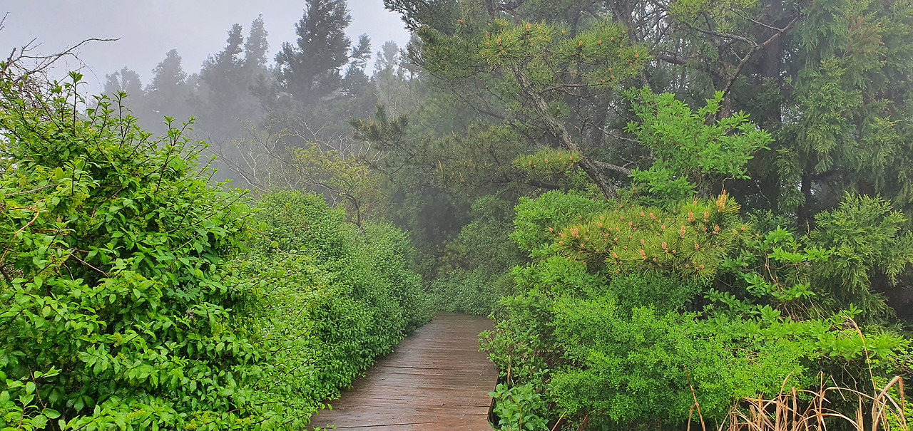 거문오름 탐방안내소에서 예약 명단을 확인하고 출입증을 받았다. 빗줄기가 거세진다. 안내소에서 우비를 사서 입고 12시 30분 출발선에 모여 자연유산 해설사와 인사를 하고 탐방 시 주의사항을 듣고 30명쯤 일행과 함께 출발한다. 출발지에서 오르막길을 걷고 전망대로 가는 250 계단을 올라간다. 비와 안개에 갇힌 삼나무 군락 사이로 계단을 오른다. 해발 456m의 정상이다. 정상을 지나 전망대에서 주변 오름을 볼 수 있지만 안개와 구름이 산을 점령했다.