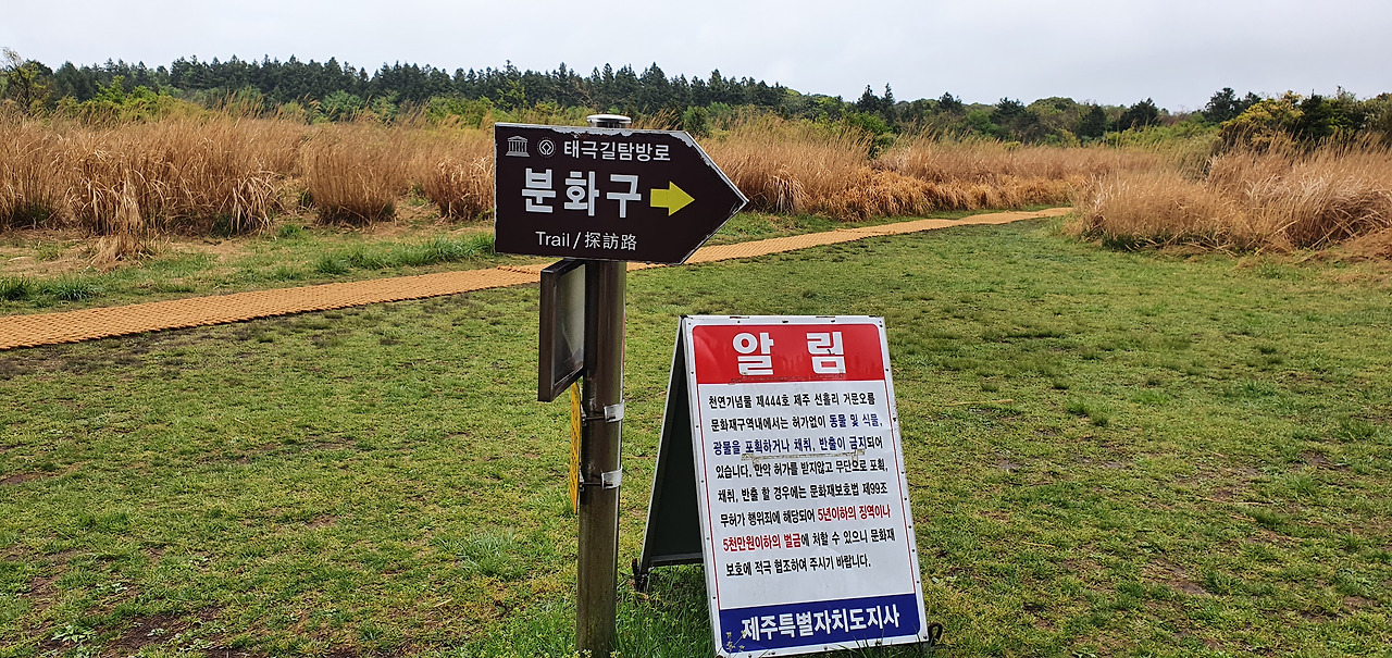 정상에서 1.5km를 걸어 만나는 안내 초소에서 몇몇 일행이 탐방안내소로 돌아가고 20명쯤 다시 분화구 코스로 출발한다. 억새가 가득한 탐방로를 걸어 곶자왈로 들어간다.