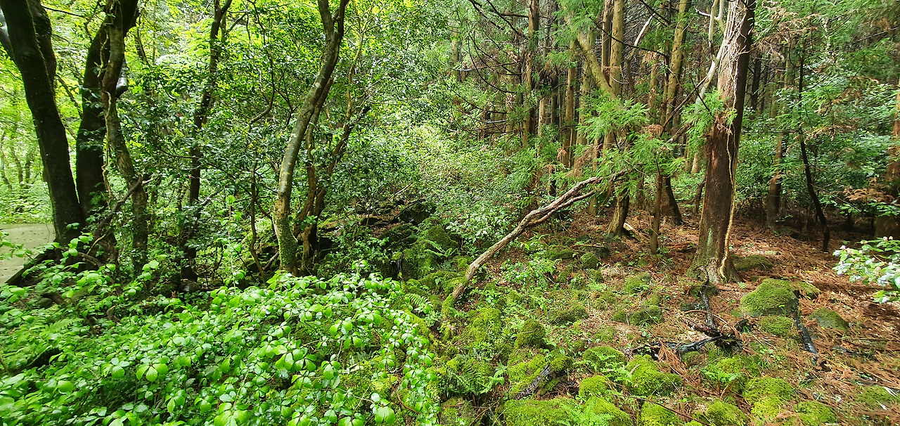 곶자왈에 들어서자 비가 멈추고 초록의 잎이 반짝인다. 분화구 알오름 전망대와 거문오름 정상1룡을 오르고 일본군 갱도 진지, 숯가마터, 풍혈(숨골), 화산탄, 수직동굴 등을 지난다. 거문오름은 철저하게 관리되어 길을 걷는 도중 쓰레기를 볼 수 없다. 오롯이 숲을 그대로 느낄 수 있다. 봄꽃이 초록의 잎 사이로 얼굴을 내민다.