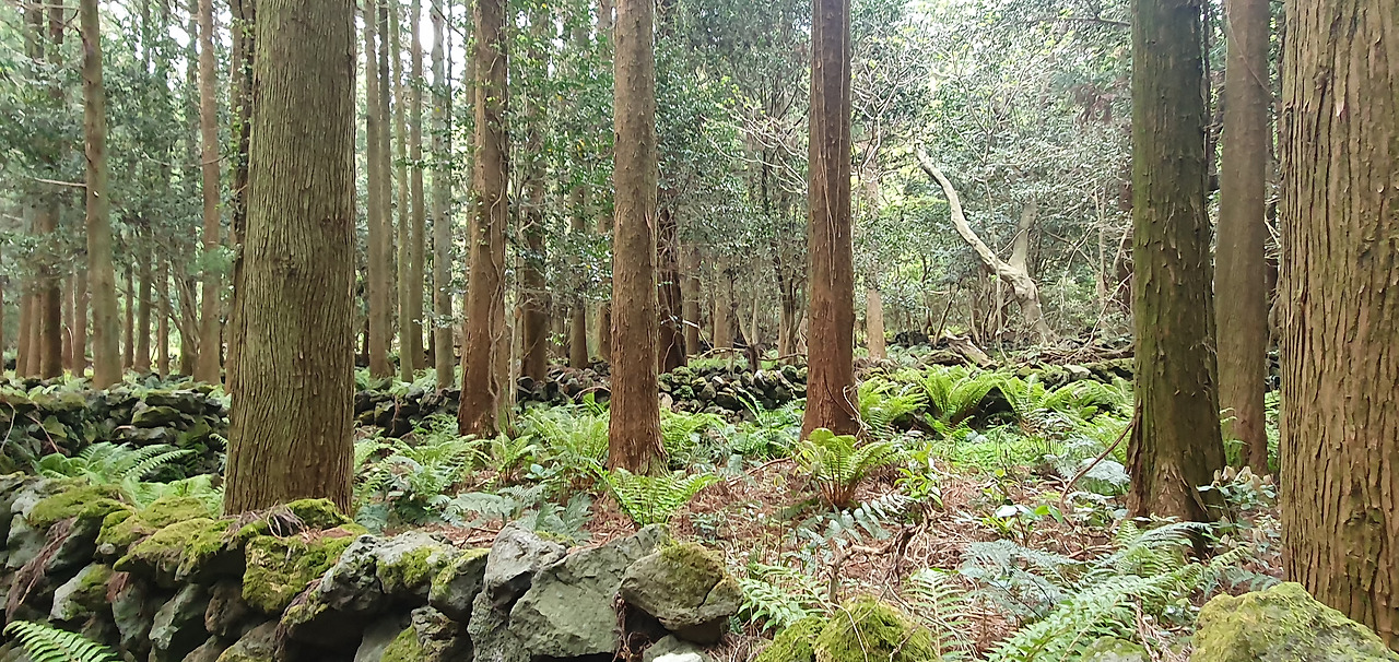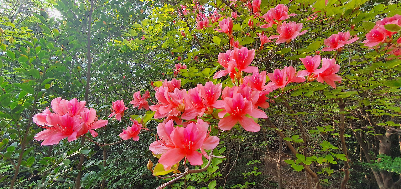다시 편백나무 삼나무 가득한 길을 지나 소롱콧길로 들어선다. 소롱콧길에는 주민들의 옛 집터가 남아있다. 초록색 이끼가 선명한 검은 돌담이 삶의 흔적을 말한다. 돌담을 돌아 돌아 걸으며 그 흔적을 떠올린다. 마지막 계곡을 따라 이어지는 길에 분홍색 꽃들이 피었다. 도시에서는 볼 수 없는 키 큰 철쭉이 숲을 환하게 빛낸다. 머체왓 숲길은 끝없는 변주가 이어진다.
