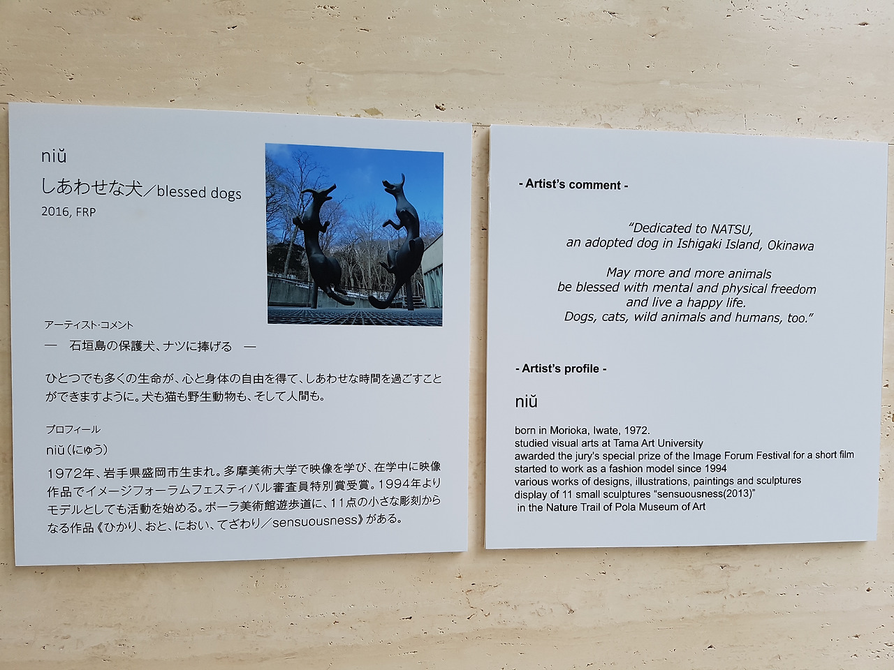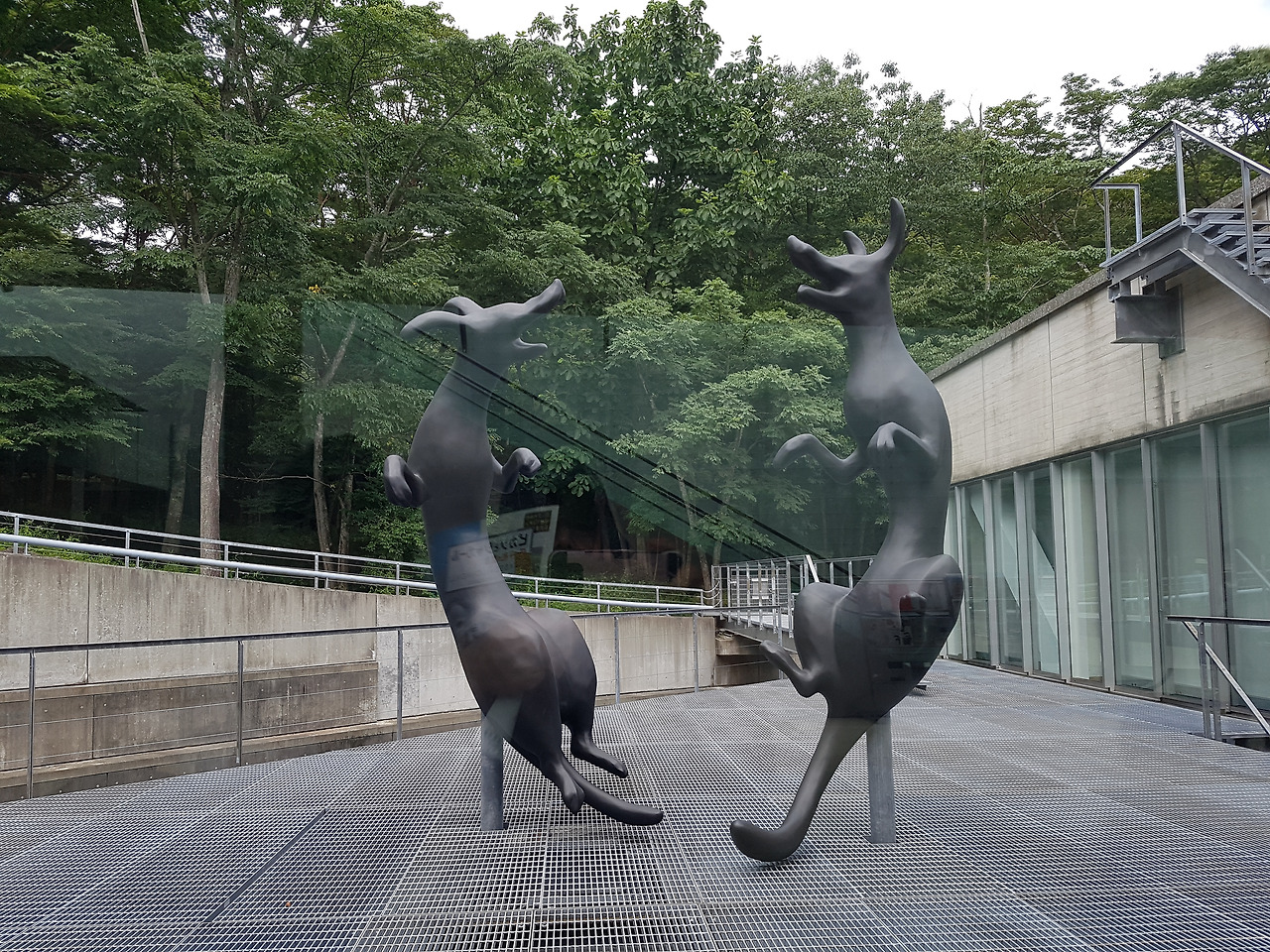 나오시마의 지중미술관처럼 지상부의 높이를 최소화하고 지하에 설계한 미술관, 하코네 국립공원을 훼손하지 않고 숲과 조화를 이루어내는 아름다운 미술관이다. 미술관 입구에 행복한 두 마리의 강아지들이 우리를 맞아준다. 작가는 오키나와에서 입양된 개를 떠올린 듯, "더 많은 동물들이 마음도 몸도 자유롭게 행복하게 살 수 있기를 바란다. 개들도 고양이들도 야생의 동물들도 그리고 우리 인간들 역시...."라고 말한다.