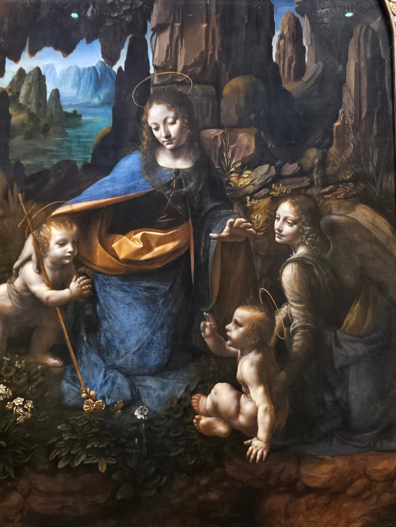 베네치아 르네상스 천재 화가 티치아노의 '바카스와 아리아드네', 보티첼리의 '비너스와 마르스'를 지나 레오나르도 다빈치의 '암굴의 성모'를 마주한다. 2019년 루브르에서 보았던 암굴의 성모와 다른 느낌이다.