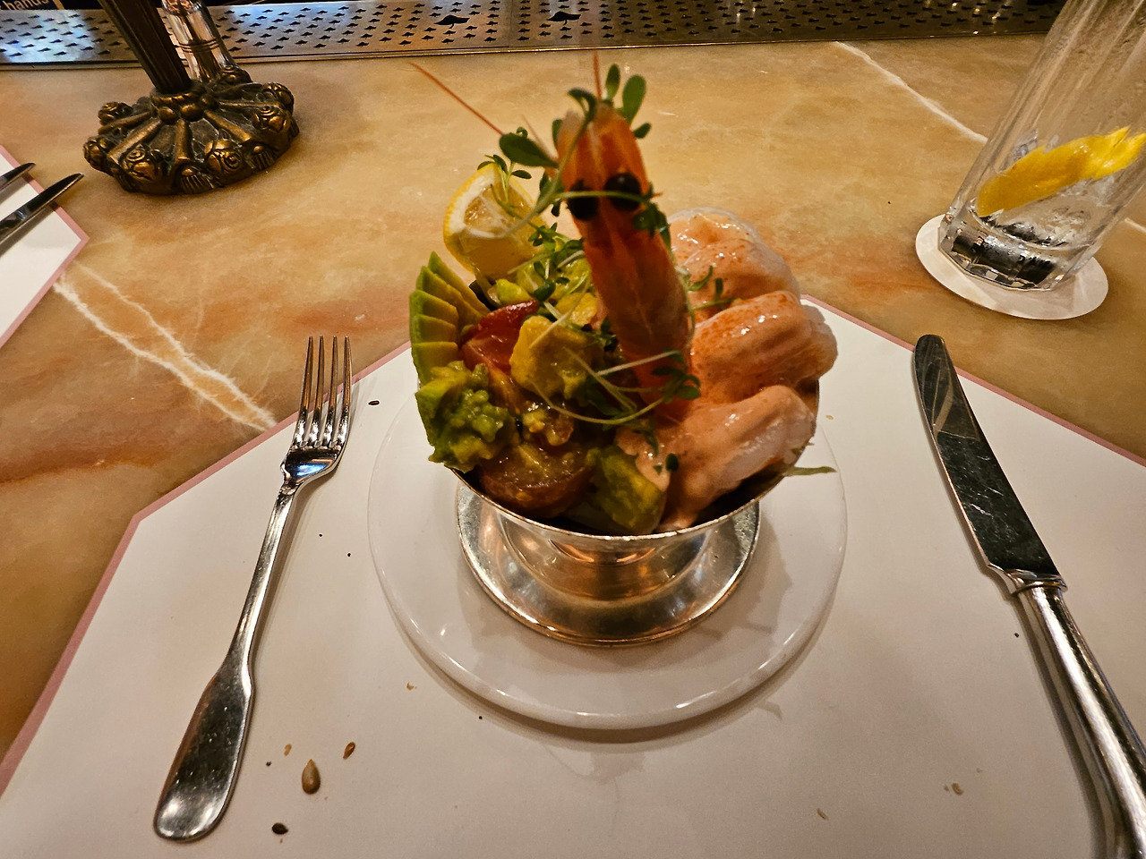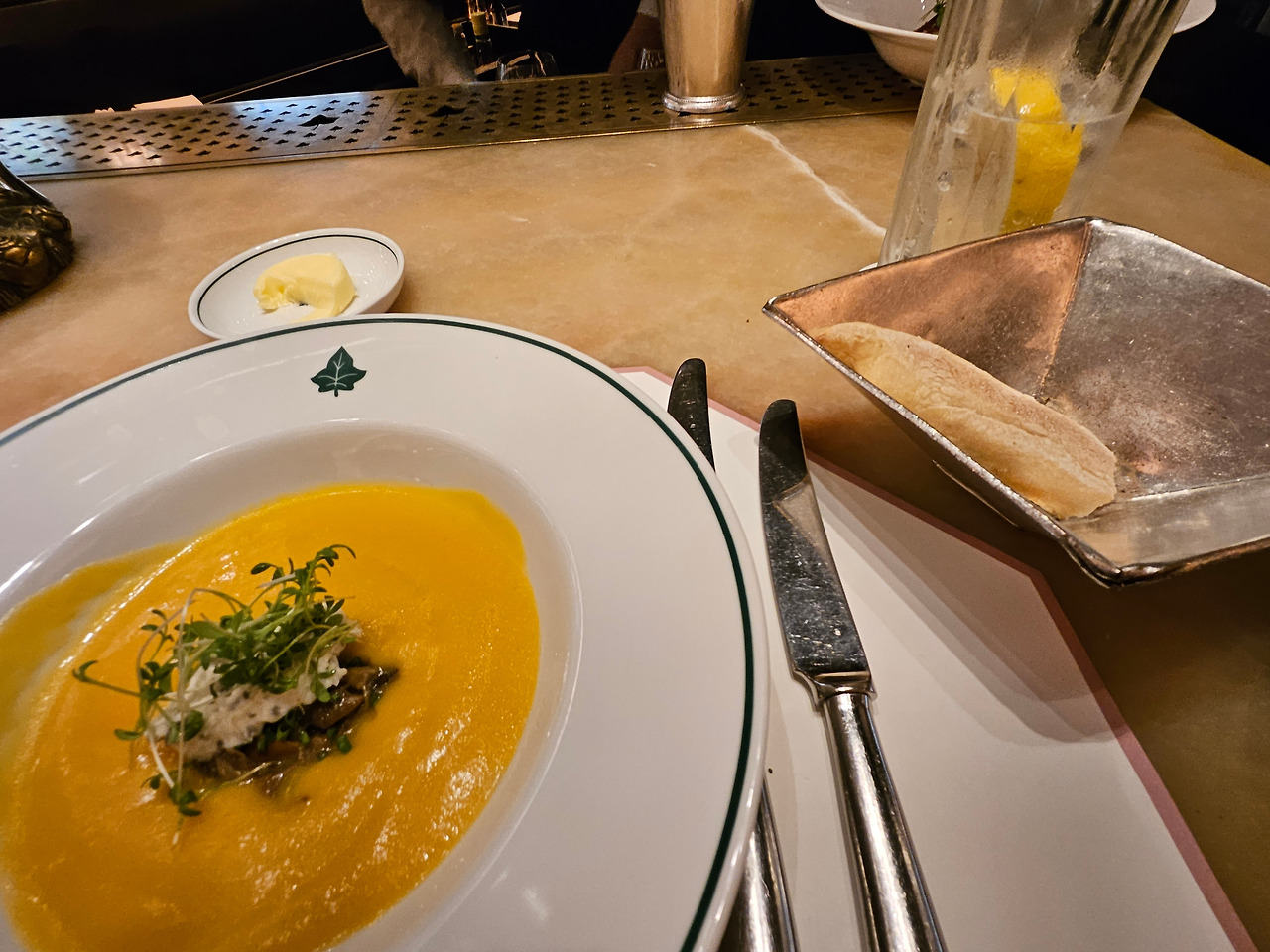 그리고 마지막 칠레 이스타섬의 모아이 석상까지! 전 세계의 유물들을 허락도 없이 강탈했다고 밖에 표현되지 않는 The Great Britain 박물관을 나선다. 비가 부슬부슬 내리기 시작한다. 열심히 공부를 했더니 배가 고프다. 뮤지컬 극장이 모여있는 타워스트리트를 지나 골목으로 들어서니 이름도 예쁜 'The Ivy'라는 음식점이 숨어있다. 고풍스러운 문을 열고 들어가니 오래된 영화에 나오는 예쁜 식당이다. 친절하게 예약여부를 물어보는 직원에게 예약은 하지 않았다고 말하고 직원이 나를 가운데 Bar 자리에 안내했다. 의자가 높은 Bar에 앉아 둘러보니 모두 백인들이다. 내가 그들을 둘러보는 동시에 그들의 시선이 내게 다가온다. 쌀쌀한 날씨를 녹여주는 예쁘고 맛있는 호박 수프와 새우 아보카도 칵테일 샐러드가 눈도 입도 사로잡는다.