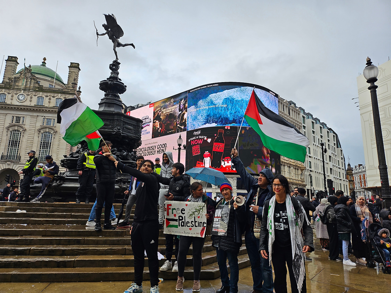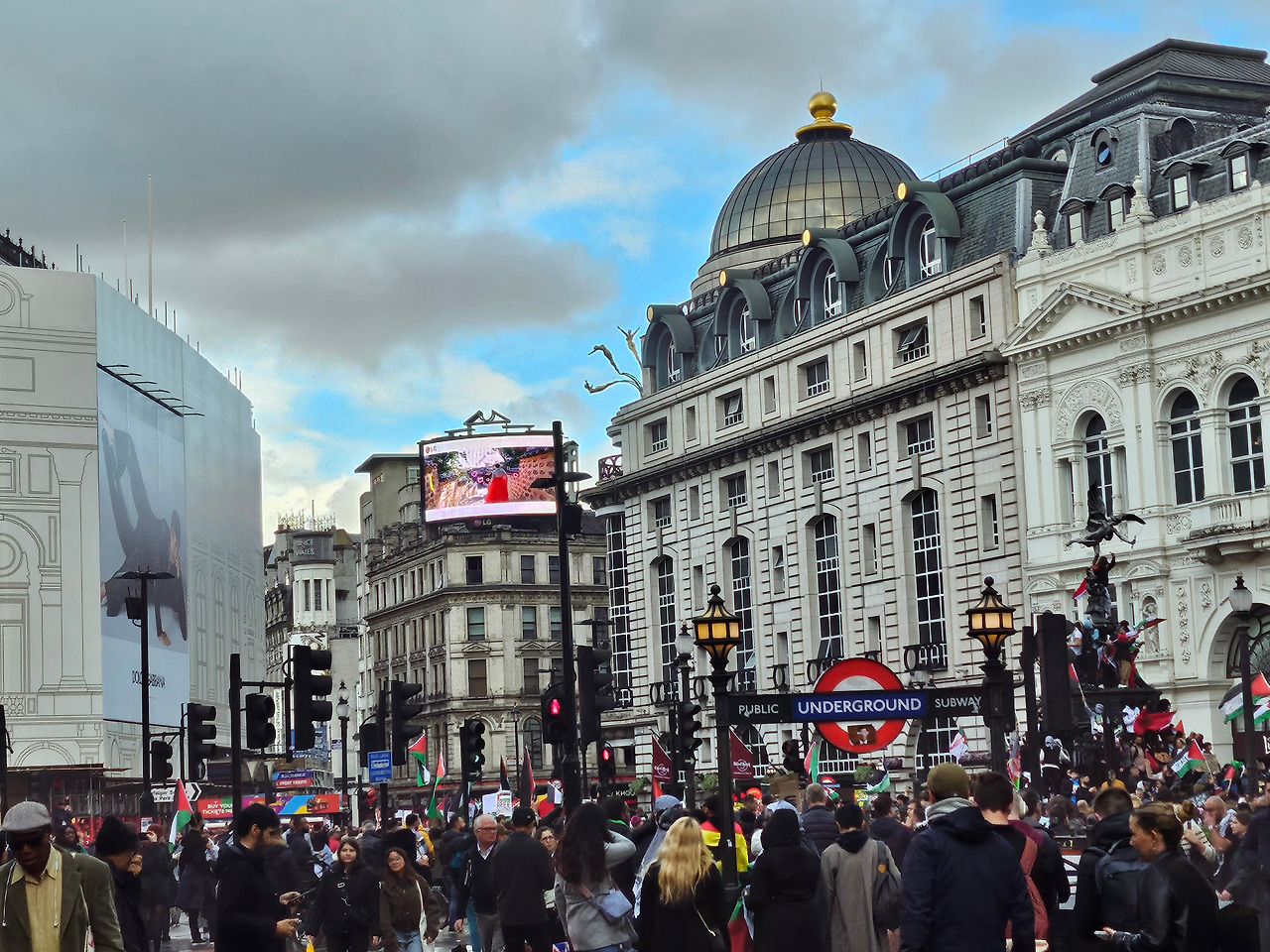 모처럼 늦잠을 자고 일어나 천천히 지하철을 타고 피카달리 서커스 역에서 내리니 역에 사람들이 가득하다. 개찰구로 나가는 줄이 끝이 없다. 아무리 주말이라고 해도 이상한 느낌이다. 지하철 계단으로 나오는데 출구에 분홍색 연기가 보인다. 밖으로 나오니 피카달리 서커스 광장에 집회가 열리고 빨간 연기 사이로 사람들이 이리저리 뛰고 있다. 나는 딸의 손을 잡고 '최루탄인가 봐! '하고 뛰었다. 딸은 웃으며'최루탄이 아니고 축구 경기할 때 쓰는 폭죽이야! 하며 괜찮다고 나를 안심시킨다. '팔레스타인에 자유를!', '가자지구 폭격 중단!'을 외치는 팔레스타인 시위대 중간에 부모의 손을 잡고 나선 어린아이들 모습이 보여 마음이 아프다. 전쟁 없는 세상이 올 수 있을까! 저 아이들이 어른이 될 때에는 무고한 사람들의 희생이 없는 그런 날이 온다면 얼마나 좋을까 하는 생각을 해본다.