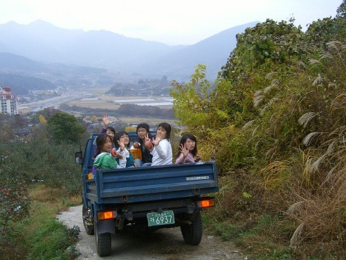 사과와 함께 여학생들은 트럭을 타고 내려가고.