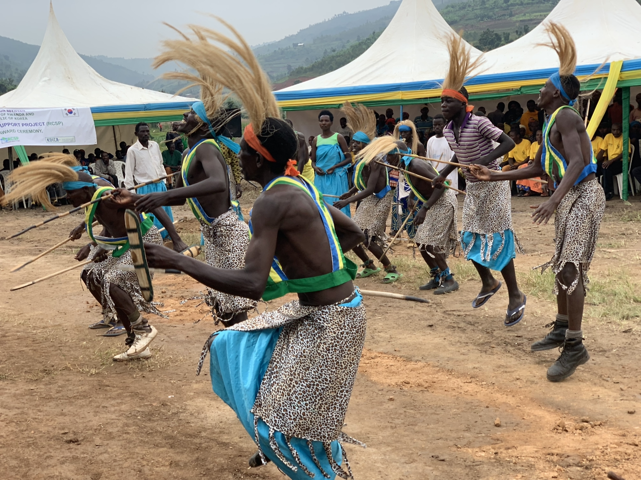 르완다의 전통춤은 코이카가 지원하는 농촌마을 행사 때 본 게 제일 인상적이었다. 마을 주민들이 행사를 위해 자발적으로 모여 연습한 것이라 열정과 활기가 있었다. 여성들의 옷차림이 예쁜데 보자기 같은 천을 한 쪽 어깨에 둘러 간편하게 멋을 내는 게 전통의상이다. 남자들은 발목에 방울을 달고 락커처럼 머리를 흔들며 춤을 춘다. 전통북과 피리도 등장한다.