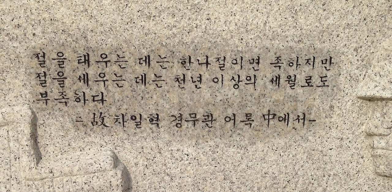 화엄사 입구에는 2013년에 세워진 차일혁 경무관의 공덕비가 있다. 이념 대립의 광풍이 지리산 구석구석을 휘몰아치던 때가 있었다. 지리산 화엄사는 그 비극의 소용돌이에서 동포를 살리고자 애썼고 그로 인해 핍박 받았던 한 의인의 용기를 전해주면서 ‘화엄’의 참뜻을 돌아보게 했다. 모순과 대립을 넘어선 참다운 조화, 화엄 세상을 향한 염원을 그 어디에서보다 강렬한 인상으로 마음에 새겨준 곳이 내게는 지리산 화엄사였다.