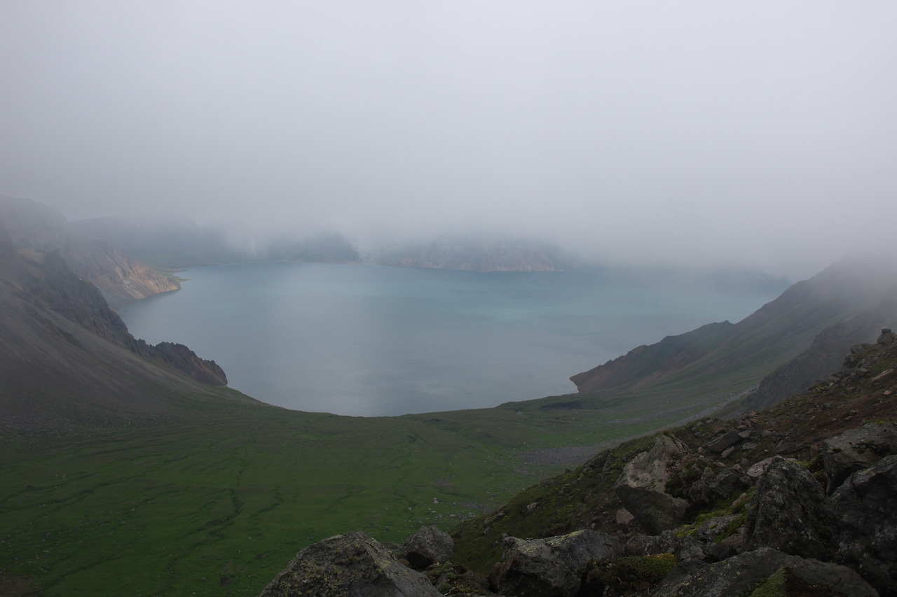 반가움에 뛰어내려가니 천지가 살짝 열리고 있었다. 안개가 잠깐 걷히면서 연푸른빛 수면과 주위 산들의 실루엣이 드러난 것이다. 그 섬광 같은 순간을 어떻게 표현해야 할까. 하지만 그 순간도 잠시, 안개는 다시 호수를 삼켜버렸다.