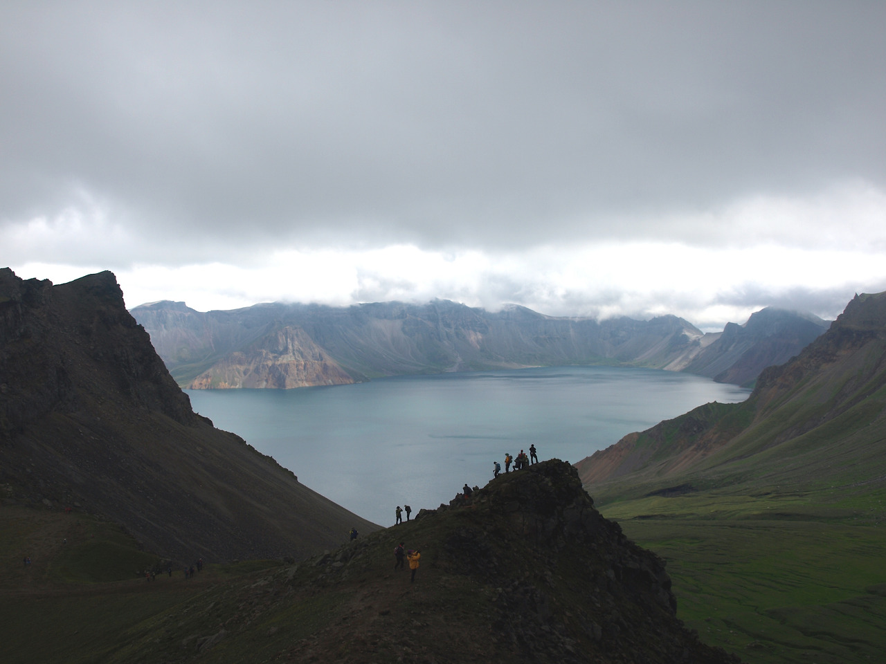 오후가 되니 바람이 잦아들면서 안개가 걷히기 시작했다. 용문봉이 가까울 무렵, 안개는 완전히 물러났다. 하늘은 트이지 않았지만 길을 가면서 옆으로 살짝 살짝 드러나는 천지의 아름다움은 특별한 데가 있었다. 사진으로 많이 봐서 별 기대 없이 왔는데, 실제로 보니 훨씬 야생적이고 신비롭다. 천지와의 첫만남은 우리를 아득한 시원으로 데려가 주었다.