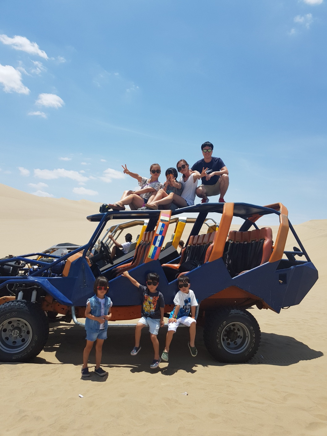 버기카를 타기 위한 장소로 이동을 했다. 사막을 즐기기 위한 관광객들이 적지 않았다. 가격을 흥정하는 소리와 투어에 필요한 물건을 파는 소리가 여기저기서 들렸다. 사막을 달리기 때문에 선글라스나 고글이 필수였다. 아이들은 선글라스가 없었기 때문에 급하게 아이들용 선글라스를 구입해 씌어줬다. 꼬맹이들도 선글라스를 쓰니 꽤 그럴싸했다. 버기카를 난생처음 봤는데 지금까지 내가 본 그 어떤 차들 중에 가장 거대하고 단단했다. 사막에서 달릴 수 있게 개조해 만든 차량이라고 한다. 아이들은 각기 다른 디자인과 멋을 내는 버기카들 중에 가장 마음에 드는 버기카를 골랐다. 우리는 어린아이들이 있었기 때문에 다른 일행과 섞이지 않고 우리들끼리만 이용하기로 했다.
