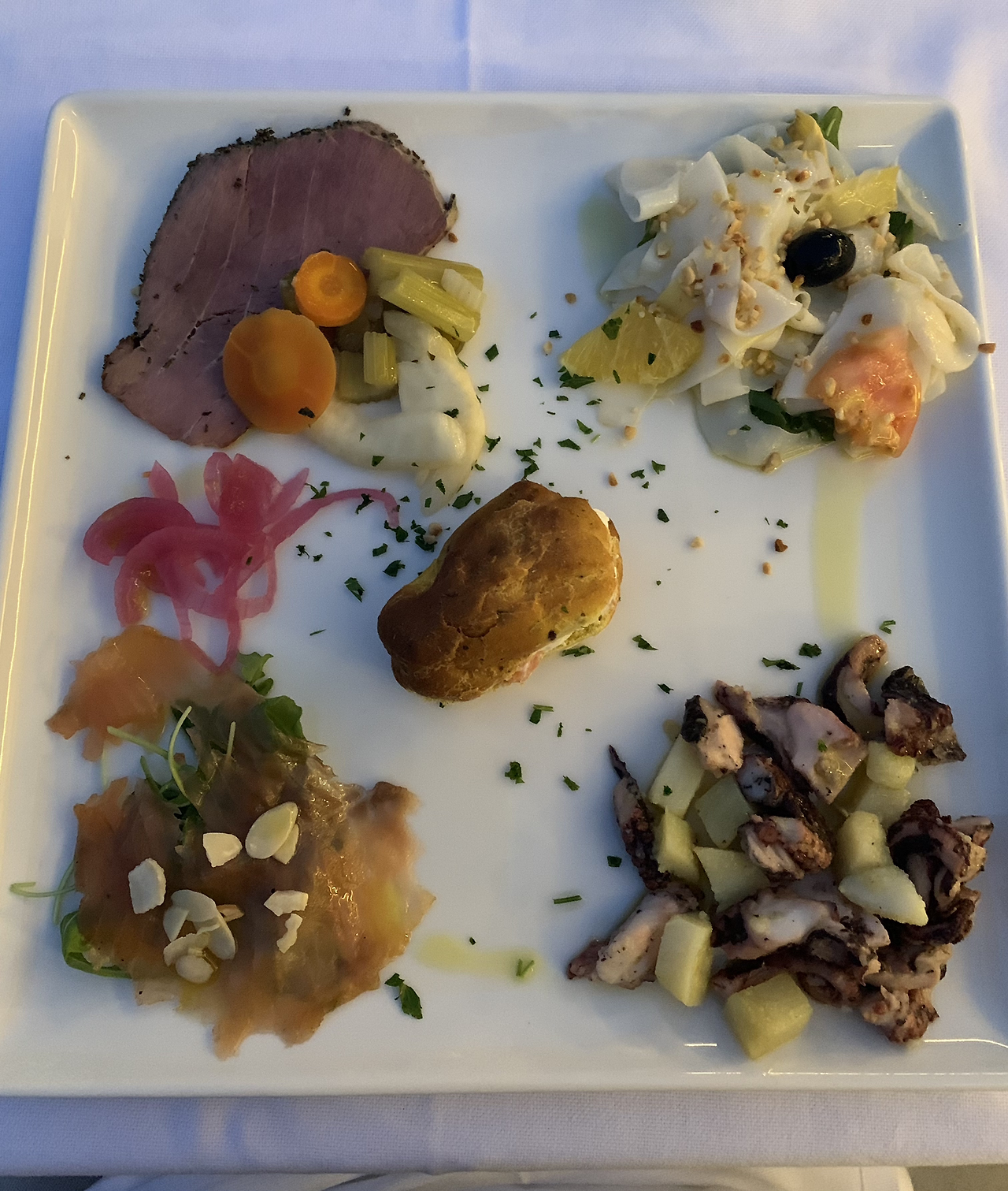 여러 맛 집중 생선 음식을 좋아하는 나는 이번 여행에서도 역시 그롯탐마레 Grottammare 의 내가 좋아하는 스텔라 마리나 Stella Marina (불가사리)에서의 저녁 식사를 지나칠 수 없었다. 마지막으로 왔던 때가 아마도 7년 전쯤이었던 것 같은데 이번에도 여전히 상쾌한 만족감을 주는 식당으로 재확인했다. 저녁 바닷바람의 향기로움과 함께 다양한 생선 안티파스토를 맛보며 메뉴가 바뀔 때마다 수시로 포크를 바꾸어 주는 깔끔한 섬세함이 나를 항상 더 매료시킨다.