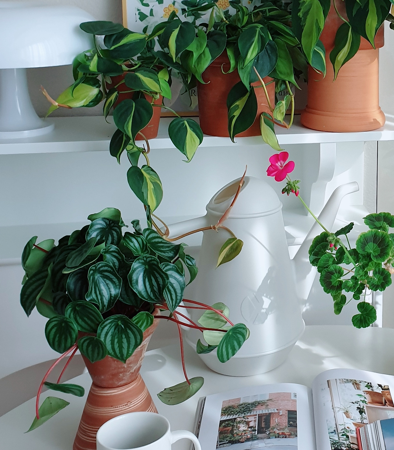 수박페페는 만져보면 잎의 두께가 좀 있는데 페페 종류가 대부분 그렇듯 건조에 강한듯하다. 대신 습도에는 약하다. 그래서 물을 미리 주지 않고 수박페페가 물을 달라고 할 때 그때 준다. 그게 언제 인가 하면 수박페페 잎을 만져보면 톡톡하던 잎이 좀 얇아지고 줄기가 축축 쳐지면 준다. 건조해서 줄기가 쳐졌을 땐 한 두 잎이 말라서 죽을 수도 있지만 그건 괜찮다. 건조가 아니라 물을 많이 줘서 습하면 그땐 잎들은 우수수 다 떨궈버린다. 한 번은 화분 하나를 분갈이하면서 원하지 않을 때 물을 줬더니 뿌리가 녹아서 잎들이 줄기부터 떨어지며 가을에 낙엽 떨어지듯 속절없이 떨어지는데 마음이 다 떨어지는 줄 알았다.