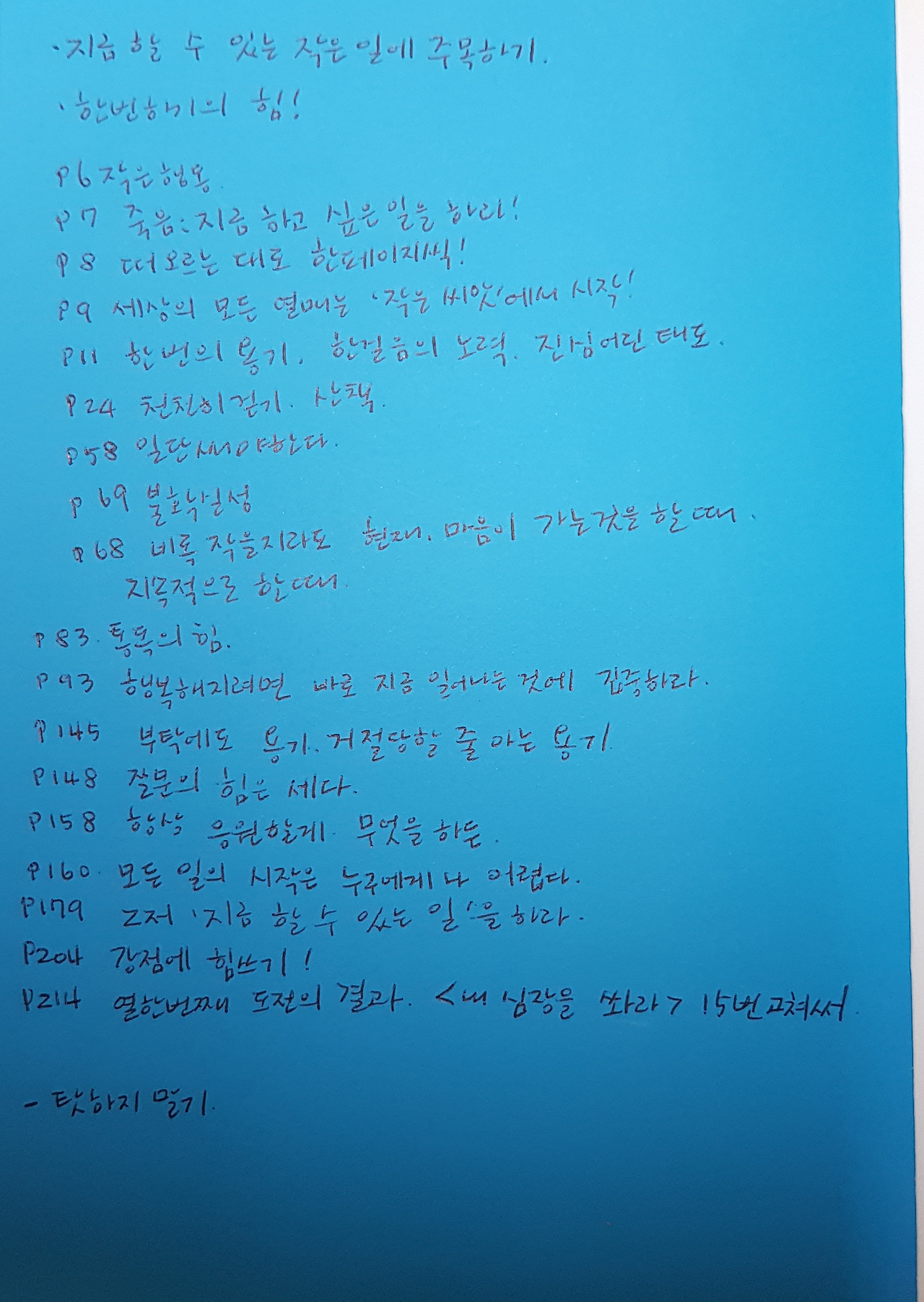 나는 책을 쓰고 싶어 하지만 마음만 앞서지 시작하지 못하고 있다. 쓰지 못하는 이유는 백만 개쯤은 된다. 이 책의 저자는 ‘한번 걷기’가 준 힘을 느낀 후 매일 한 줄씩 글을 썼다고 한다. 그러면서 한 권의 책을 내는 계기가 되었다니, 생각만 해도 가슴이 뛴다.