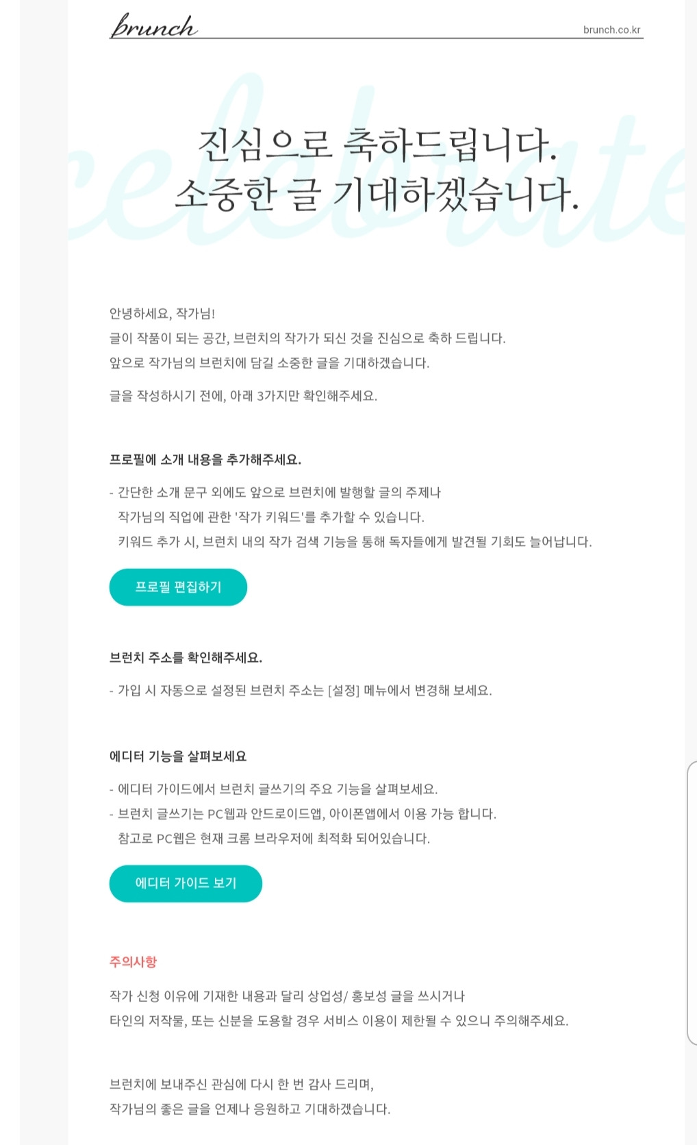 인터넷에 접속했다가 '브런치 작가' 축하 메일을 받았다.