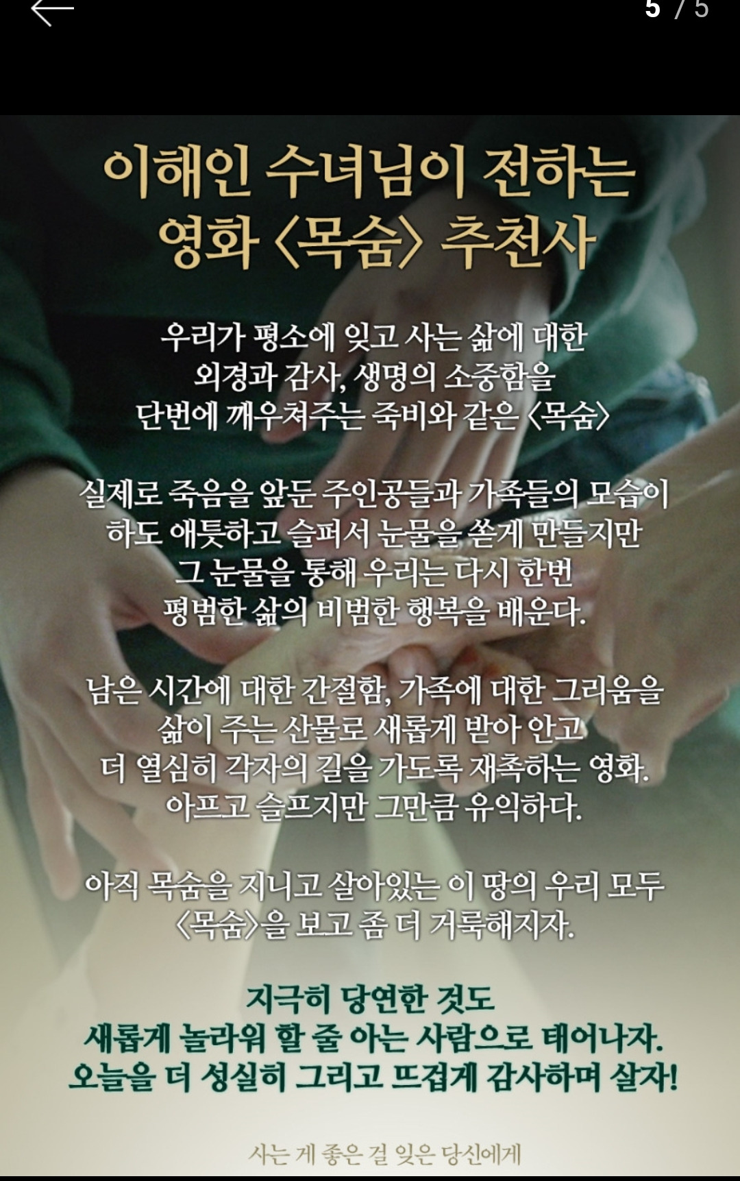 하지만 기자가 서두에서 밝혔듯 '호스피스 병원에서 죽음을 맞이하는 환자들의 최후의 일상을 담은 다큐멘터리'이지만 '감독은 환자들에 대한 존중을 잃지 않으면서 그들의 죽음을 착취하지 않으려 애쓴다'는 구절에 나는 이 영화를 지켜보고 싶어졌다.