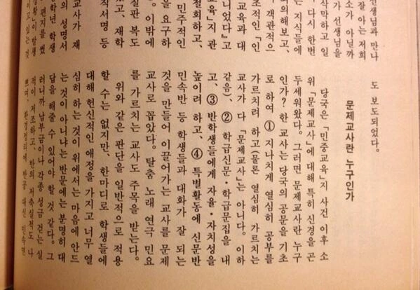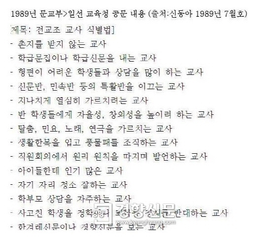 "지금부터 호명하는 교사들은 왼쪽으로 서 주시기 바랍니다. 촌지를 받지 않는 교사, 학급문집이나 학급신문을 내는 교사, 지나치게 열심히 가르치려는 교사, 반 학생들에게 자율성, 창의성을 높이려 하는 교사, 직원회의에서 원리 원칙을 따지며 발언하는 교사, 아이들한테 인기 많은 교사…."