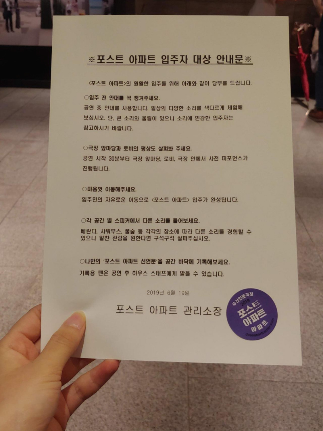 공연이 끝난 후, 우리는 펜을 받는다. 내가 생각하는 아파트의 미래를 꿈꾸고 그것을 계단이나 바닥 등 우리가 속해있던 공간에 쓸 수 있다. 우리는 보고 듣고, 참여하고 또 만들어가고, 앞으로의 우리 이야기를 상상해보는 개개인의 아파트 연출가가 되었다.