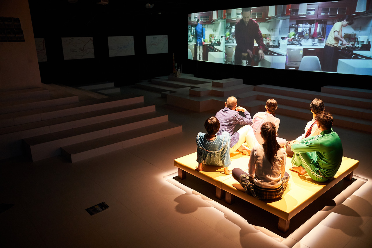 베란다, 욕실, 거실 등 아파트를 형상화하는 곳들은 대부분 다 구현되었는데, 빠진 게 있다면 부엌이었다. 부엌 공간은 대신 영상에서 구현된다. 음식을 썰고 커피를 내리고 설거지를 하는 모습을 보면서 우리는 아파트의 일상적인 모습을 보는 동시에 우리의 일상을 상상한다.