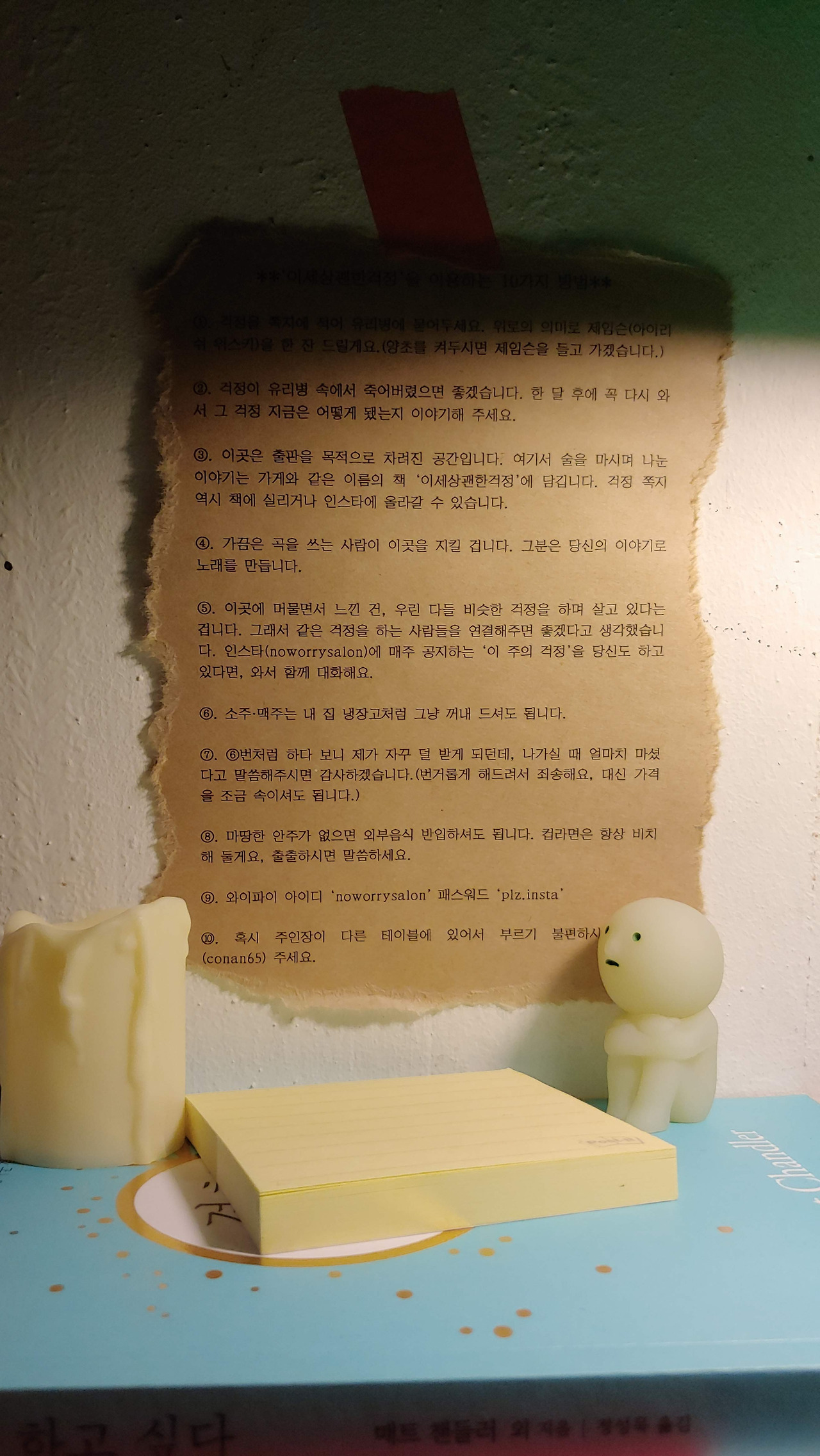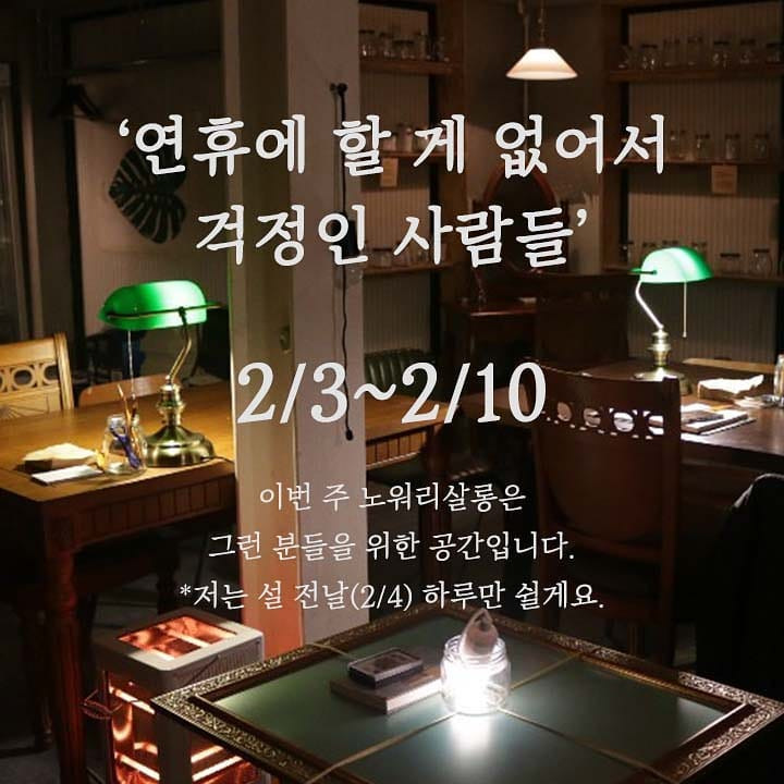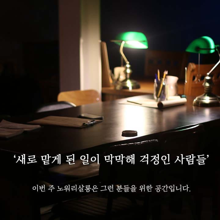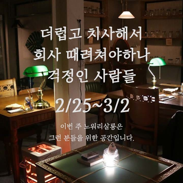 이주의 걱정이란, 주인장이 매주 바꿔다는 걱정 메뉴판이라고나 할까. ‘누군가를 혼자 사랑하는 것 같아 걱정인 사람들’, ‘연휴에 할 게 없어서 걱정인 사람들’, ‘더럽고 치사해서 회사 때려치워야 하나 걱정인 사람들’... 꼭 나를 두고 하는 말 같은 걱정들이 수두룩하다. 이 가게는 친절하게도 말해준다. “이번 주 노워리 살롱은 그런 분들을 위한 공간입니다”라고. 소주 한 잔 원샷해야 할 것만 같은 정곡을 찌르는 걱정들, 그리고 그런 걱정하는 나 같은 사람을 위한 공간이 있다고 툭 내뱉는 이 무심한 위로를 봤나.