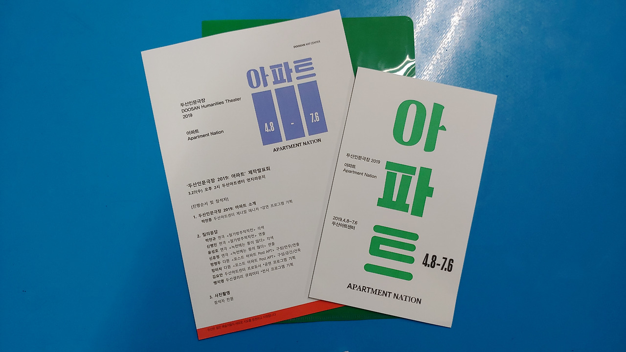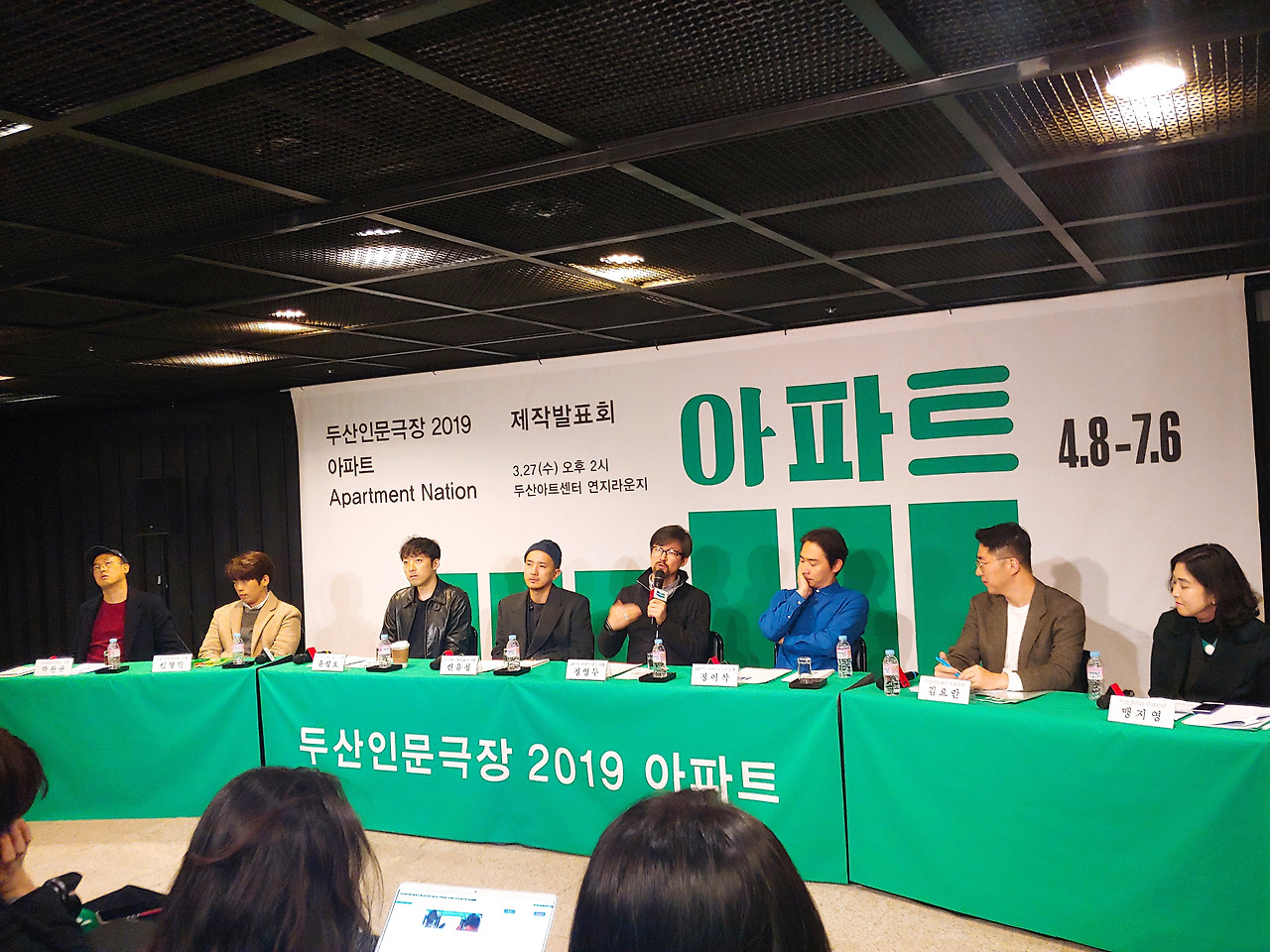 두산아트센터는 2019년 '아파트'를 테마로 한 연작 프로젝트 제작발표회를 마련했다. 이른바 '두산인문극장 2019: 아파트' 시리즈다. 4월 8일 첫 강연을 시작으로 석 달 동안 총 8번의 강연, 3편의 공연, 1편의 전시로 구성된다.