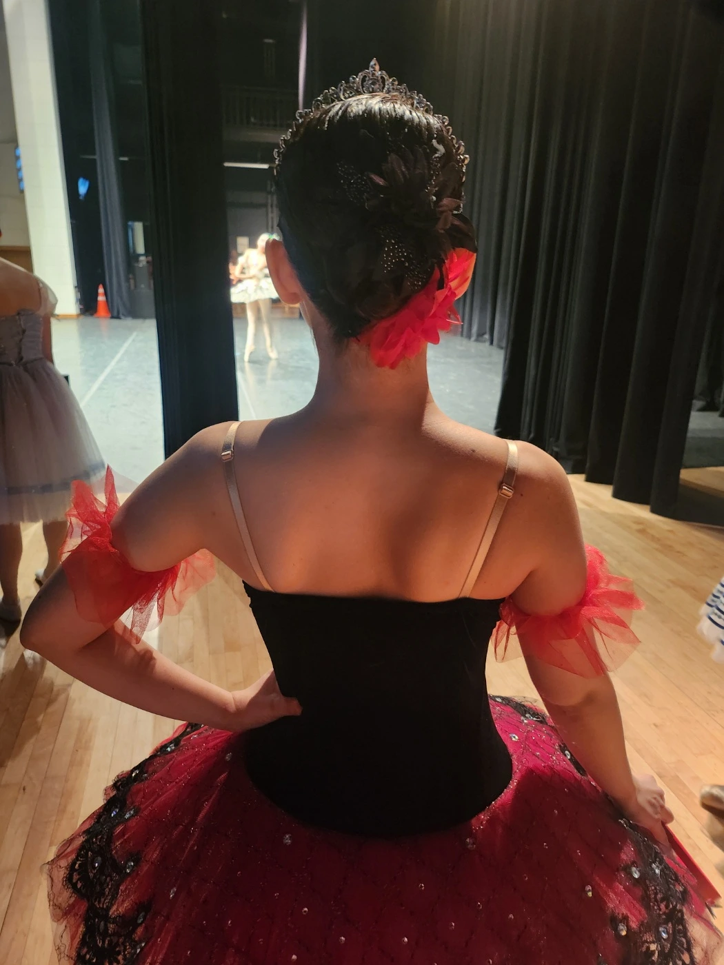 널찍하게 떨어진 큰 커튼. 눈부시게 환한 공간. 앞에 앉아있는 관중들에게 들릴 수도 있으니 조용해야 할 것 같은 공간이 의외로 작은 소음이 허용되는 공간이었다. 커튼 옆에서 각자 자기 차례가 오기를 기다렸다가, 자신 콩쿠르 음악이 시작되면, 커튼 사이에서 나와 바로 열심히 준비한 안무들을 멋지게 뽐내는 사람들을 볼 수 있었다.