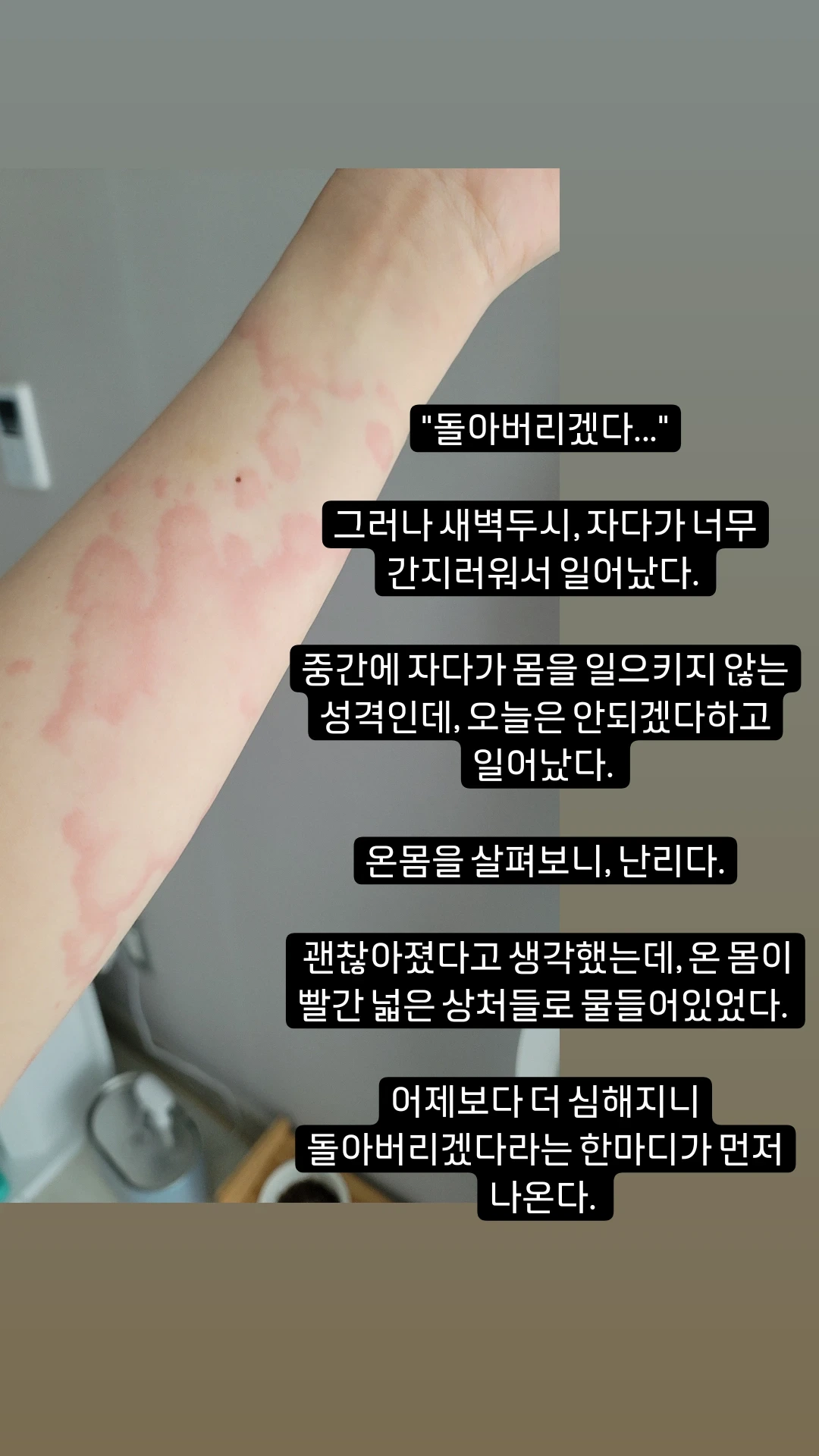 어제저녁 분명 괜찮아졌다고 생각했는데, 온몸이 빨간 넓은 상처들로 물들어있었다. 어제보다 더 심해지니 돌아버리겠다는 한마디가 먼저 나온다.