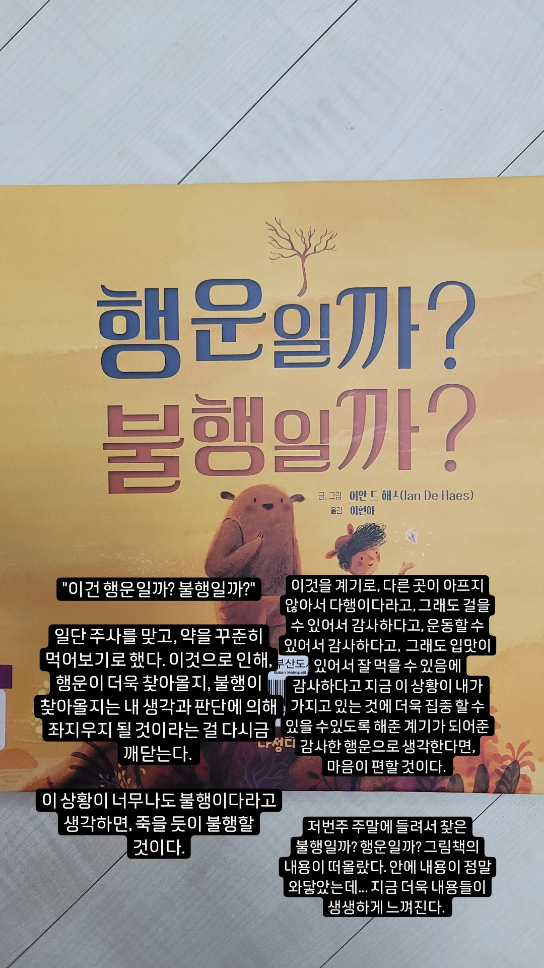저번주 주말에 들려서 찾은 "불행일까? 행운일까?" 그림책의 내용이 떠올랐다. 안에 내용이 정말 와닿았는데... 어제와 오늘 겪은 일화와 이 그림책 내용들이 너무나도 잘 접목된다.