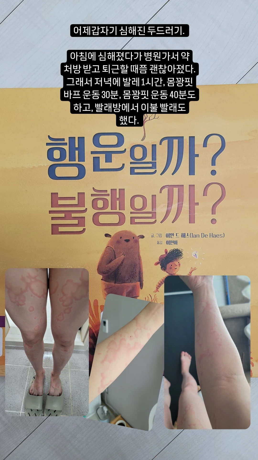 아침에 갑자기 심해진 두드러기에 경악을 했다. 그러나 아침에 호들갑 떨던 것이 무색해질 만큼, 저녁에는 매끈한 피부로 돌아왔다. 순식간에 싹 없어져버리다니... 병원 가서 약 처방받고 퇴근할 때쯤 괜찮아져서 너무나도 다행이다 생각했다. 저녁 퇴근 발레 1시간, 몸꽝핏 바프 운동 30분, 몸꽝핏 운동 40분도 하고, 빨래방에서 이불 빨래에 몰두했다.