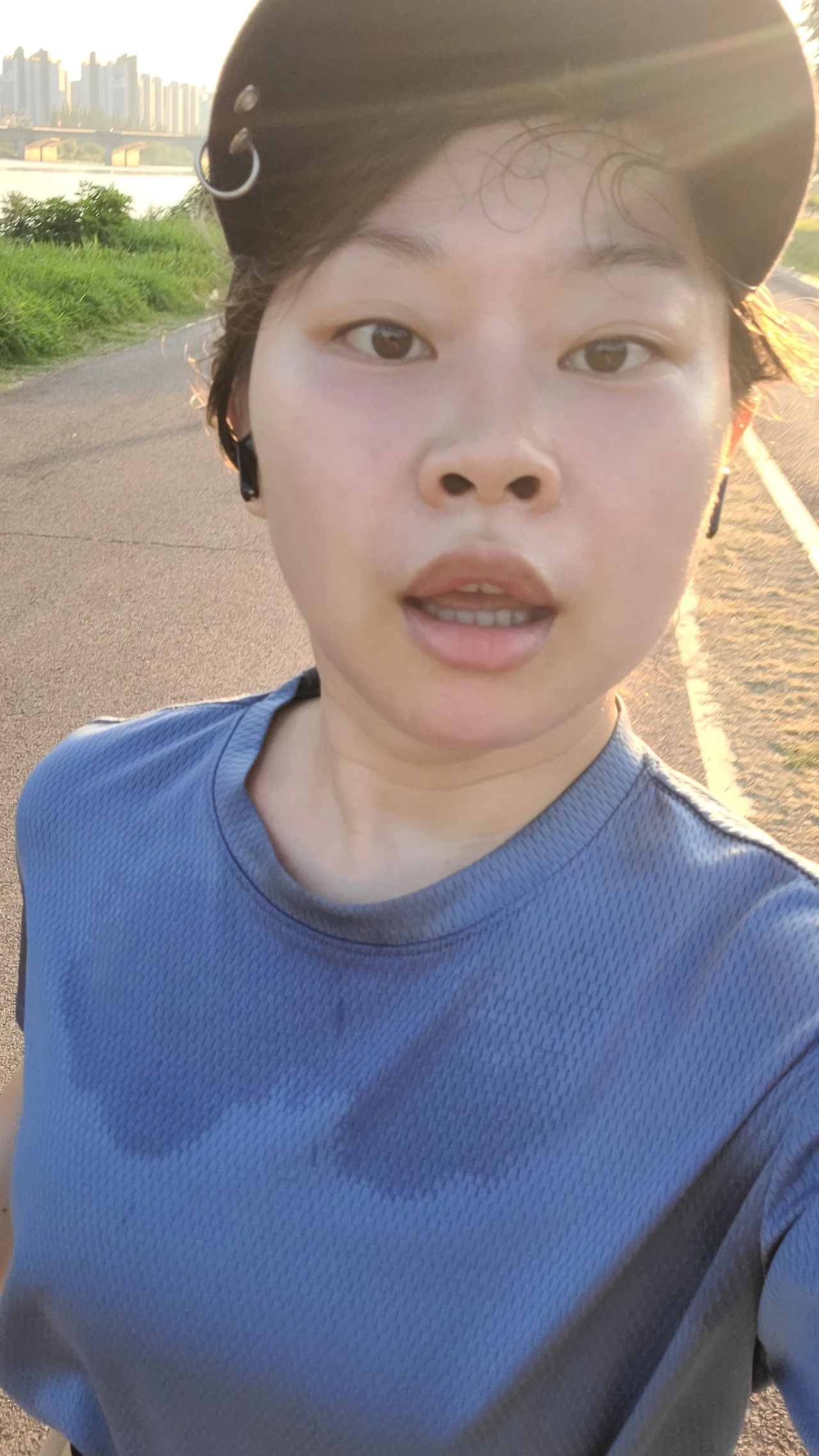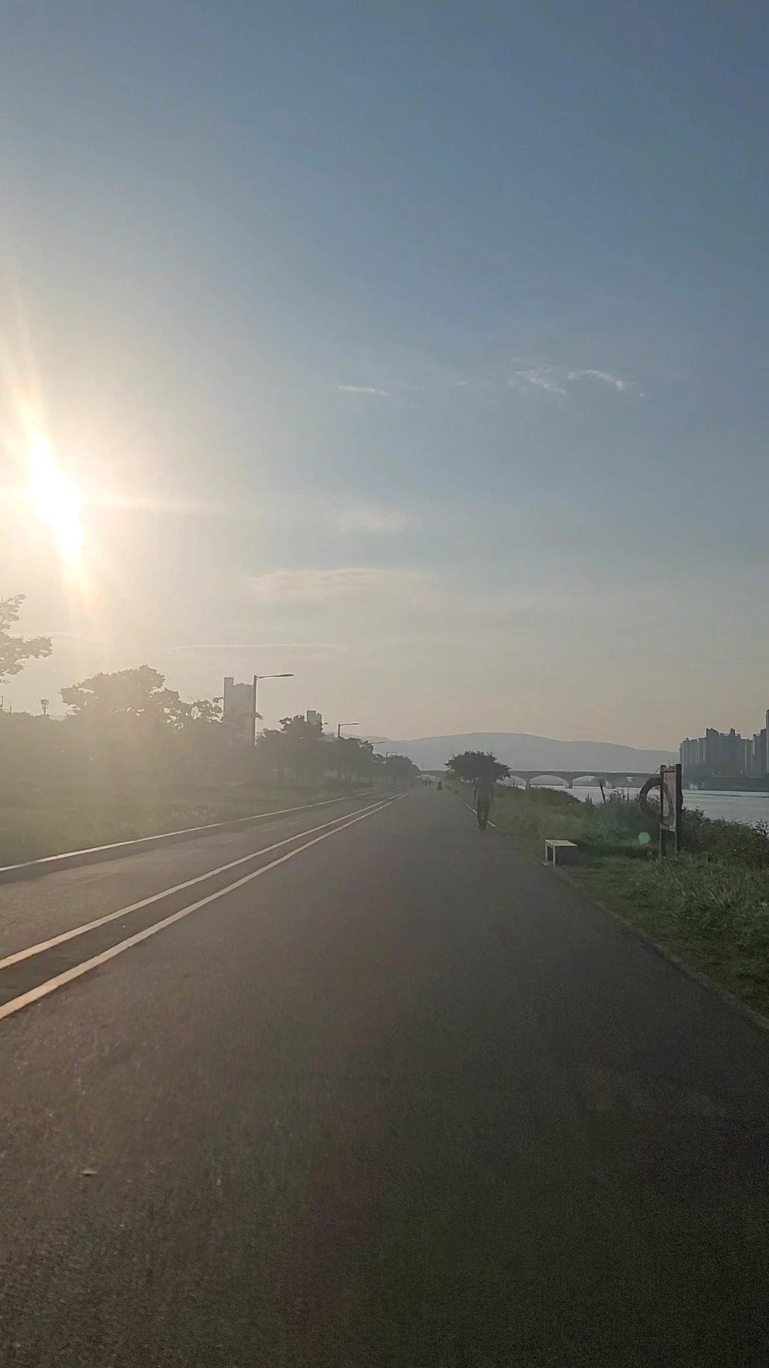 처음 스타트는 좋았다. 반환점 5km까지는 쉬지 않고 열심히 달려갔다. 끝없는 평지로 보이는 태화강의 러닝길. 태양을 등지며, 앞으로 나가는 것은 나름 정말 쉬웠다. 그러나 반환점을 돌고, 물 한 모금을 마시고, 3분을 걸은 후, 다시 뛰기 시작했다. 그리고는 약간의 간격이 좀 되게 걷고 있는 아주머니를 기준으로 다시 달리자는 아빠의 목표에 따라 움직였다.