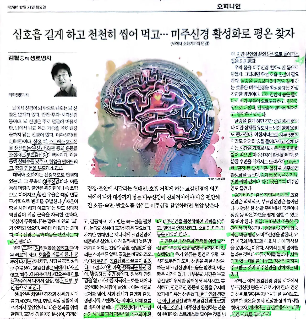 그러나 최근 본 의학전문기자 분이 쓰신 기사. 뇌에서 소화기까지 연결되어있는 미주신경, 부교감신경이 활성화되어 정신적으로 건강하게 살아갈 수 있다는 기사였다. 날숨을 들숨보다 2배 정도 길게 하고 코로 천천히 숨을 들마시면서 배가 부풀어 오르도록 하고, 천천히 입으로 내쉬는 호흡 훈련. 이런 호흡 속에서 우리는 긴 들숨에 혈압은 떨어지고 불안은 사라진다고 한다.