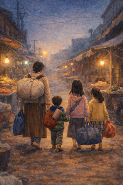 엄마는 우리 삼 남매의 손을 잡고