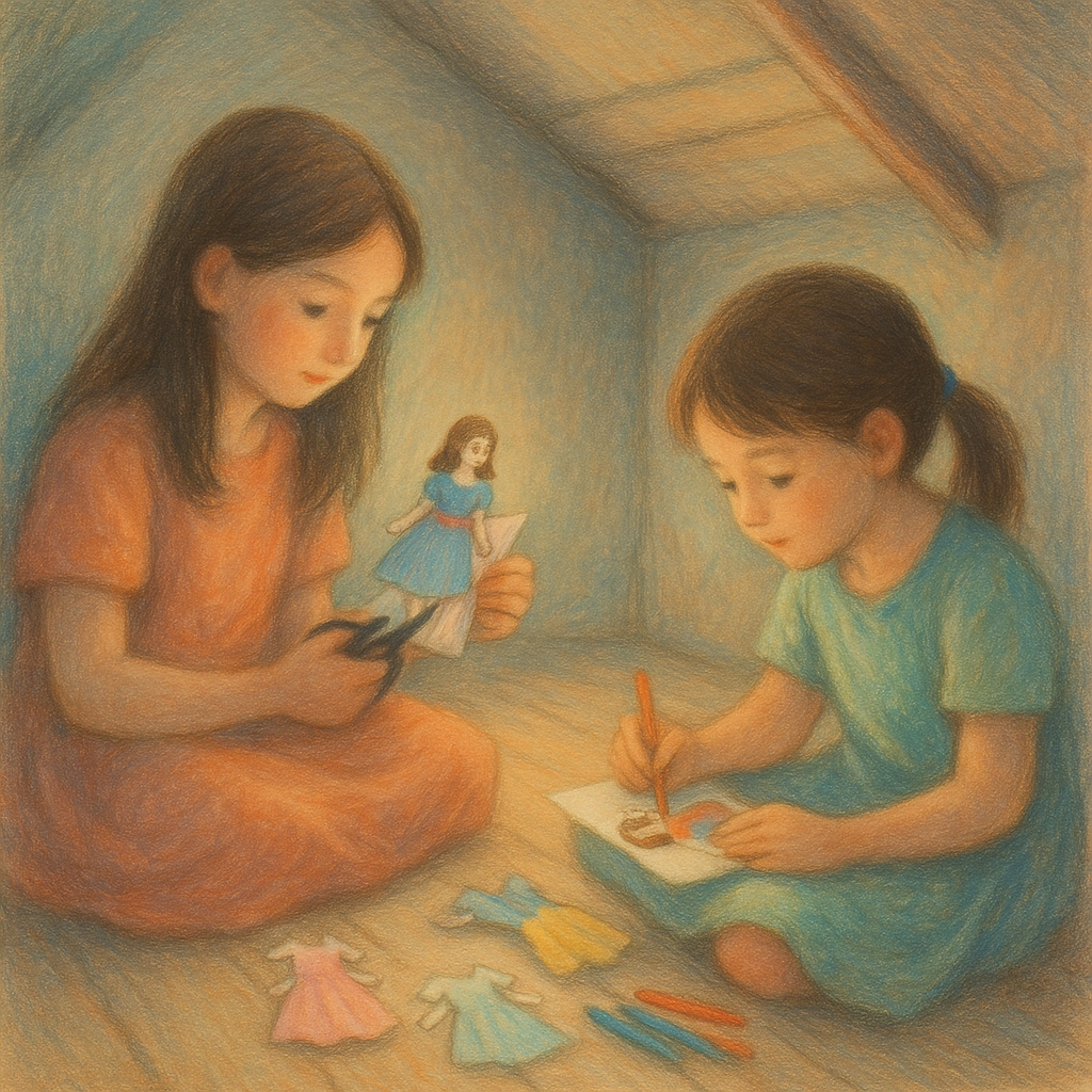 다락방에서 우리는 종이 인형에게 새로운 옷을 입히며 내일을 만들었습니다.