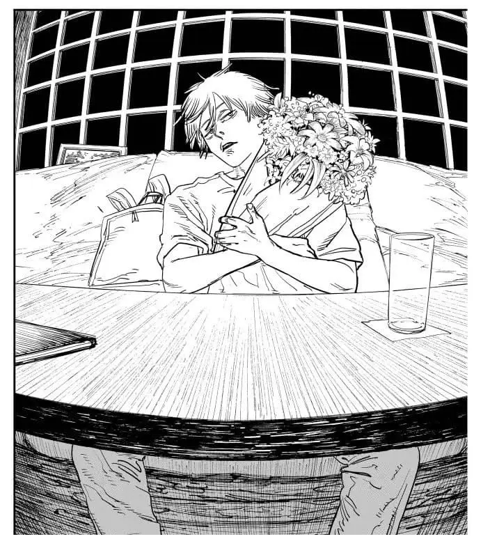 마키마와 데이트한 다음날, 자신에게 인간의 마음이 있다고 생각한 덴지는 신이 나서 출근길에 모금함에 기부하고 꽃을 받는다. 여기서 꽃은 덴지의 ‘인간의 마음’을 상징함을 알 수 있다. 덴지는 꽃을 받고 삼켜버린다.