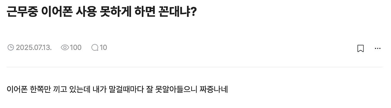여기까지 읽었지만 ‘그래도 나는 회사에서 이어폰 끼는 걸 용납할 수 없다’는 사람도 있을 것이다. 그런데 혹시 아는가? 이제는 군대에서도 이어폰을 낀다. 밥 먹을 때나 개인정비시간에 이어폰을 끼고 있어도 나이 많은 간부 말고는 뭐라 하지 않는다. 이어폰 끼느라 선임이 말하는 걸 못 들었어도 “잘못 들었슴다? 뭐라고 하셨슴까?”하고 만다. 전역한 지 이제 막 3달 된 내 경험담이다. 옛날 같으면 상상도 못 할 일 아닌가?