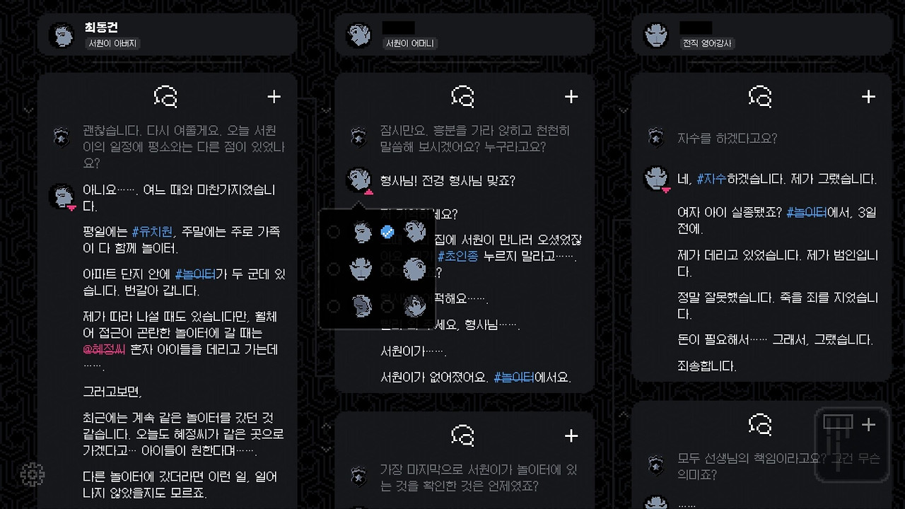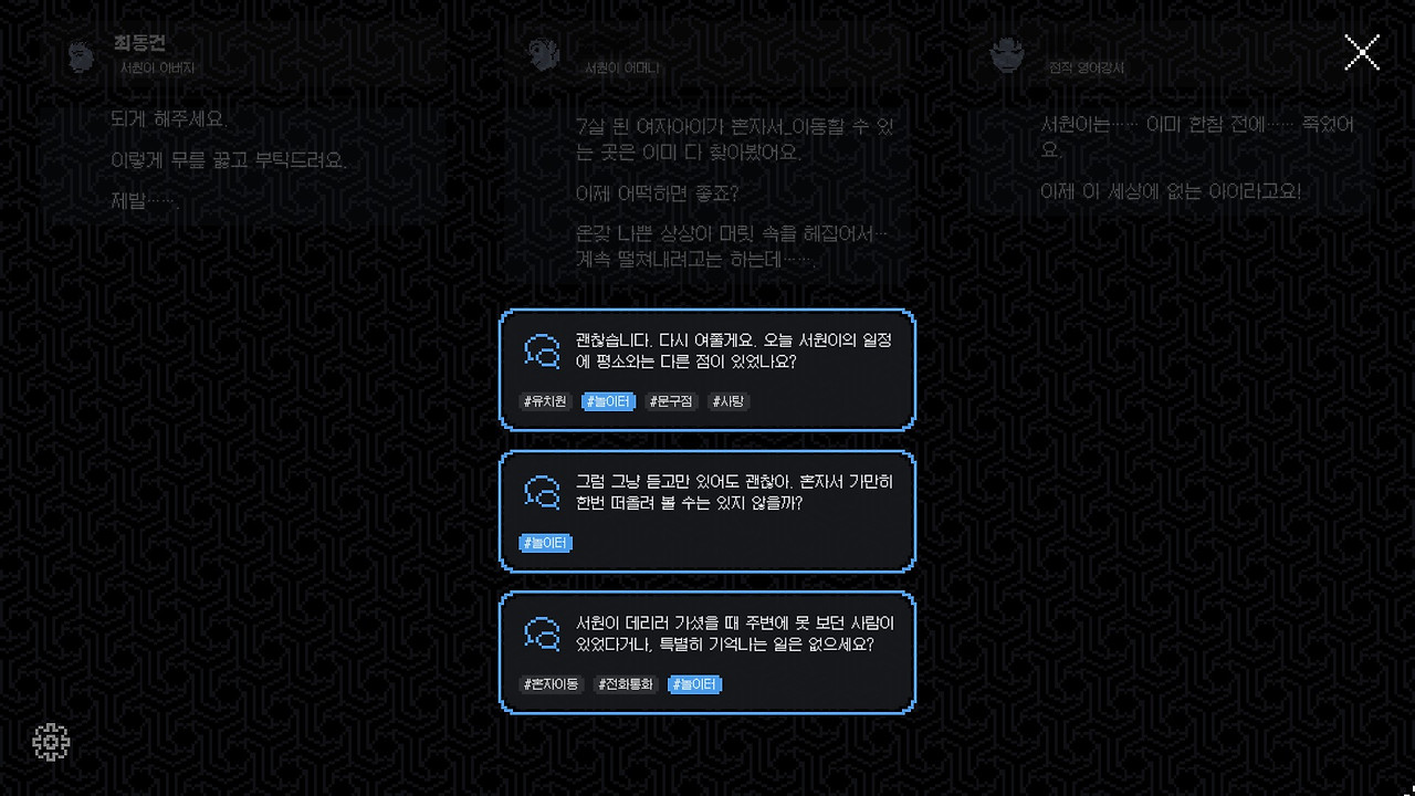 또한 어떤 대화를 먼저 수집하고, 어떤 대화를 먼저 맞히냐에 따라 플레이어가 사건의 진실을 알아가는 길이 달라진다. 게임의 스토리는 하나지만, 플레이어가 스토리를 알아가는 루트는 경우의 수가 다양하다. 이 때문에 플레이어는 어떤 대화를 먼저 해금할지, 어떤 문제를 먼저 풀지 고민한다. 내 경우는 서원이 오빠의 이야기가 궁금해서 놀이터, 문구점, 서원이 아버지 루트를 먼저 했다. 다른 쪽 이야기가 궁금했다면 다르게 플레이했을 것이다.