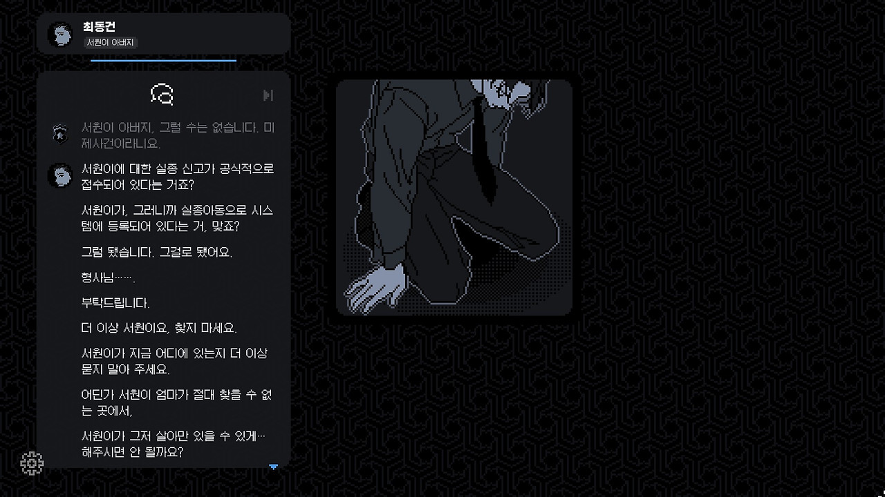 게임을 시작하면 다짜고짜 스토리가 진행된다. 은퇴한 경찰 ‘전경’에게 젊은 경찰이 찾아와 대뜸 ‘서원이 실종 사건’을 기억하냐고 묻는다. 전경은 흐릿한 기억을 최대한 더듬는다. 서원이 아버지가 서원이를 찾지 말아 달라고 부탁한 일, 서원이 어머니가 실종 신고를 한 일, 범인이 자수하여 서원이가 오래전에 죽었다고 고백한 일.