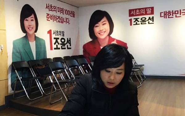 여권이 그녀를 배려해 새누리당을 탈당한 진영 의원 자리인 용산 지역구를 '전략 공천' 형식으로 내줬지만 '서초의 딸'로 남겠다며 본인이 고사한다.