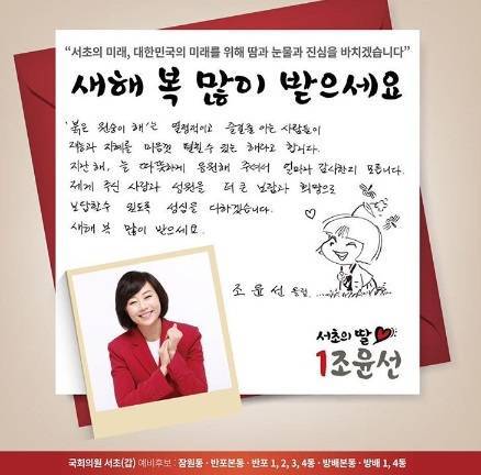 2016년 20대 총선 당시 서울 서초갑 예비후보로 등록한 조윤선 전 장관의 신년 연하장.