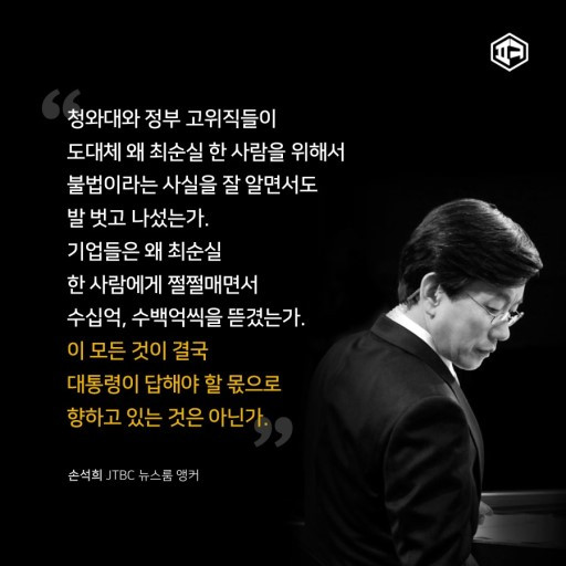작금의 사태, 많은 사람들이 분노해 하고 궁금해 하는 것. 이건 어느날 갑자기 무조건적으로 발생한 것이 아니고 (jtbc 혼자 했다고 할순 없지만 상당부분) 손석희 뉴스룸이 만든 것이다. 즉, 많은 사람들이 분노해 하거나 궁금해하는 작금 현상을 만들어낸 것, 현상의 원인이 된 것이 손석희 뉴스룸인 것이다.