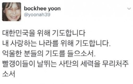 독실한 기독교 신자인 가수 윤복희 씨가 자신의 sns에 사랑하는 내 나라가 빨갱이 사탄의 세력들에 의해 결딴나지 않도록 해달라는 기도의 글을 올렸다 한다.