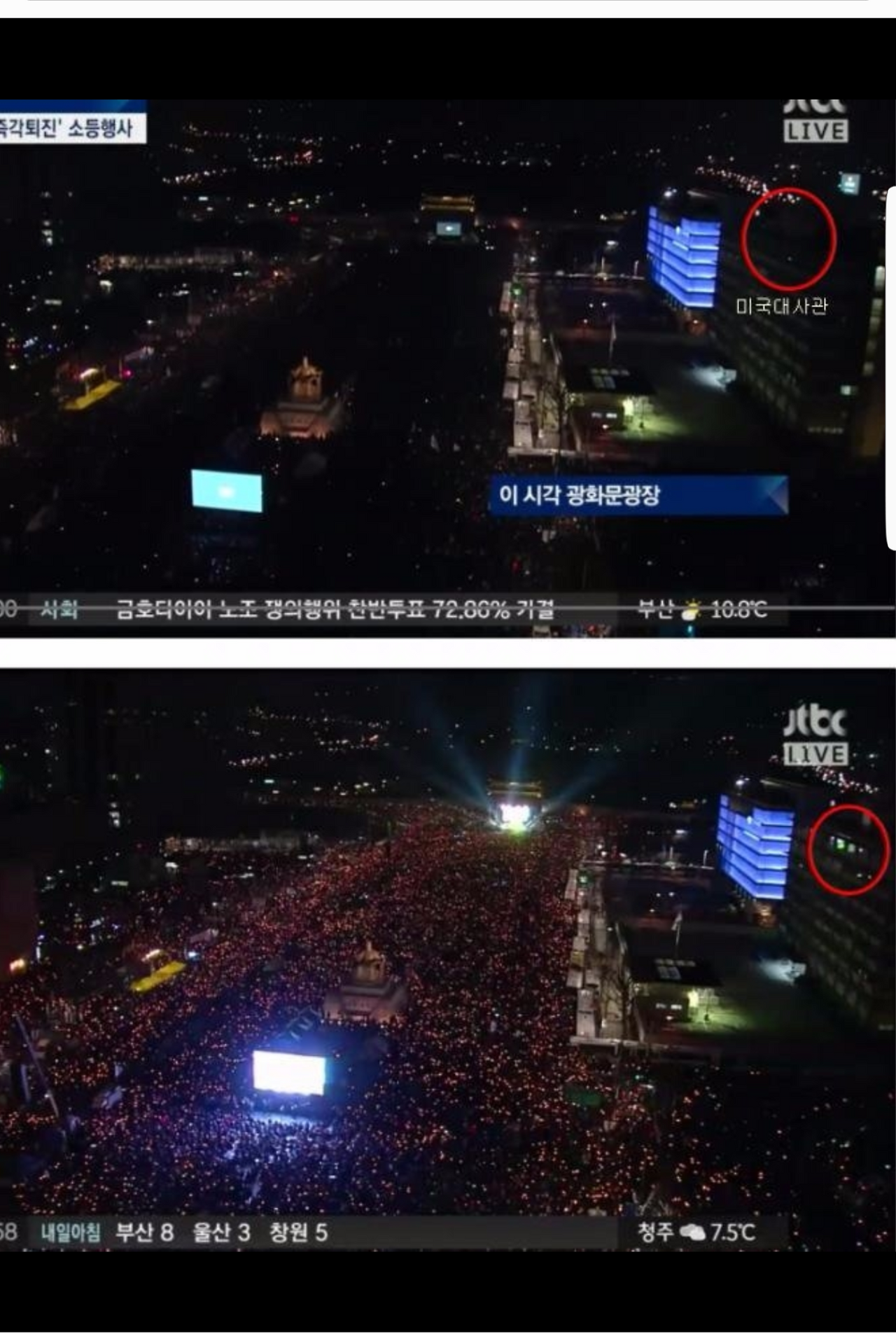 재밌는 사진이 하나 떴다. 제6차 광화문 촛불집회 저녁 7시 즉각퇴진 소등 행사 jtbc 생중계인데, 촛불이 일제히 꺼지는 순간 주한 미국 대사관 일부 사무실 전등도 같이 꺼졌다가,