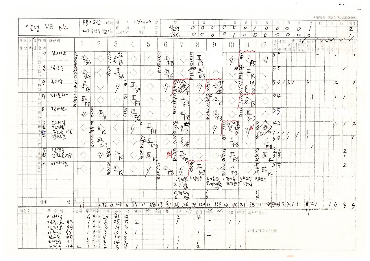 한 회 한 회가 지나면서 속도가 조금 붙는 듯하다가도 다시 플레이를 따라잡지 못하는 상황이 계속되었다. 실제 경기 시간 정도면 되겠지 생각하고 시작한 일이었지만 멈추고 되돌리고 기록법을 찾는 일이 반복되면서 좀처럼 속도가 나지 않았다. 기록을 하다가 물도 마시고 화장실도 가야 했고 심지어는 식사까지 해야 해서 시간은 더 지체되었다. KBO 리그의 평균 경기 시간은 세 시간이 조금 넘는다. 그런데 내가 택한 경기는 하필이면 연장 12회까지 진행된 네 시간이 넘는 경기였다. 세 시간 정도를 예상하고 기록을 시작했지만 이런저런 이유들로 다음 날이 되어서야 기록을 끝낼 수 있었다.