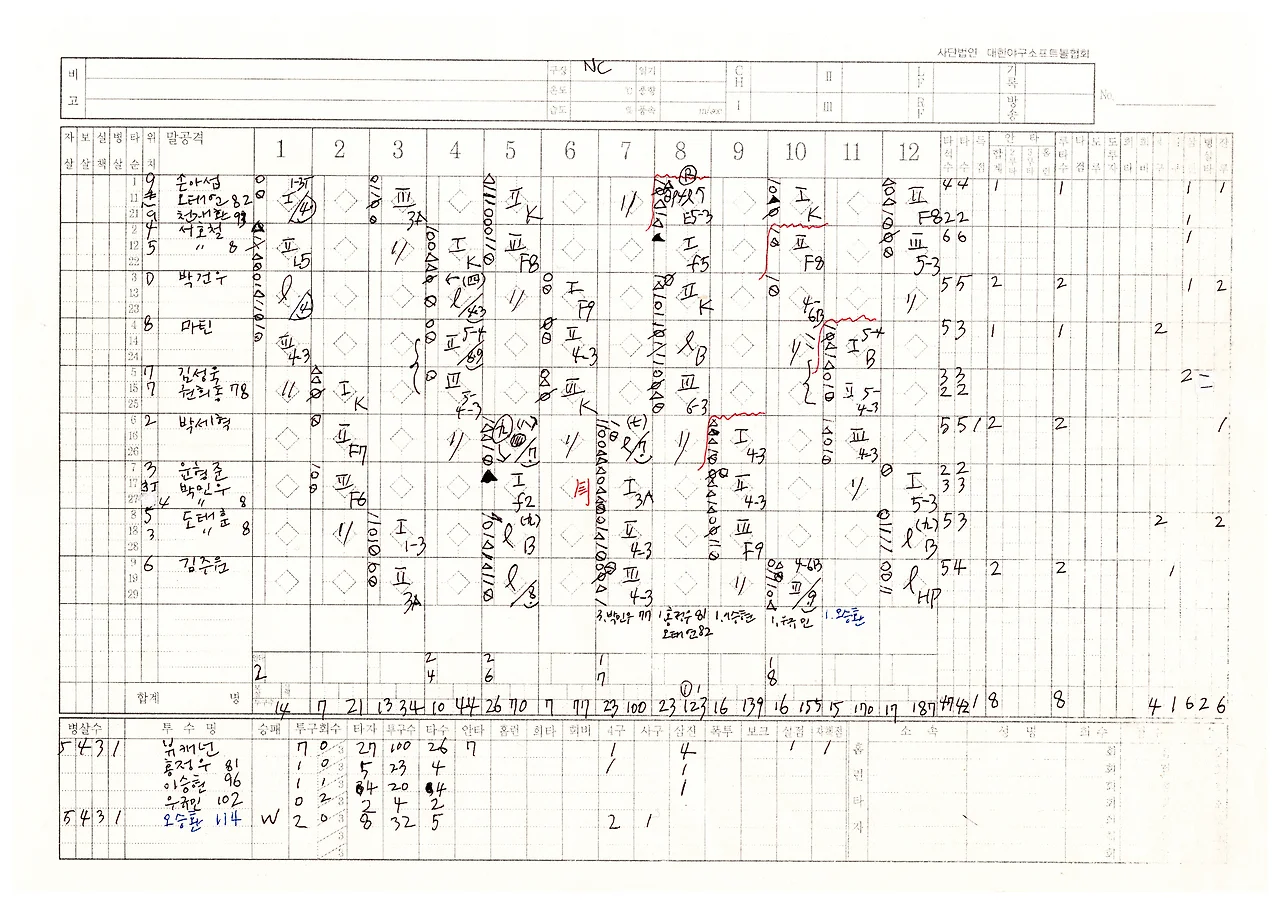 1박 2일에 걸쳐 작성한 그날의 기록지를 다시 살펴보니 전체적으로 큰 오류는 없어 보이지만 안타 표시 옆에 4와 3을 적고 중간에 점을 찍어놓은 것만은 무언가 싶다. 외야 안타에 좌중간 우중간 안타는 있어도 내야 안타에 2루 1루간 안타 같은 것은 존재하지 않는다. 그 사이로 공이 빠져나갔다면 우전 안타가 되는 것이 상식일 것이다.