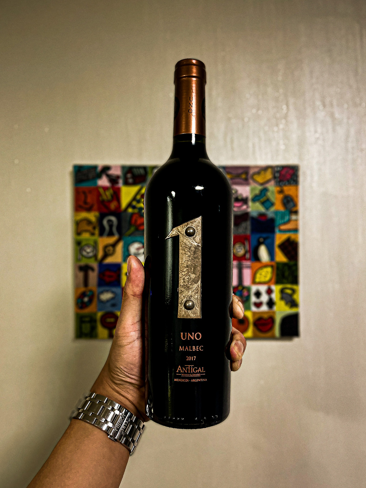 하지만 지금까지 자주 집어 들 수 있었던 가벼운 스타일의 Malbec(말벡)은 기억에서 생각보다 더 가벼웠고 이미지가 겹치기엔 너무 편안했다. Malbec(말벡)의 이미지는, 그렇게 ‘안티갈의 우노'를 만나기 전까지 하나의 고정된 느낌으로 굳혀지고 있었다. 오크통에 둘러진 금속 테두리를 가공할 생각을 하다니, 그것만으로도 인상적이다. 스테인리스, 강철의 숫자 1이 시선을 강탈한다. 이런 방식의 디자인은 여태껏 본 적 없다. 파격적인 디자인을 선도하는 건, 주로 스페인의 몫이라고만 생각하던 찰나에 진열된 수많은 와인 보틀 사이에서 [UNO]를 오랫동안 지켜봤다.