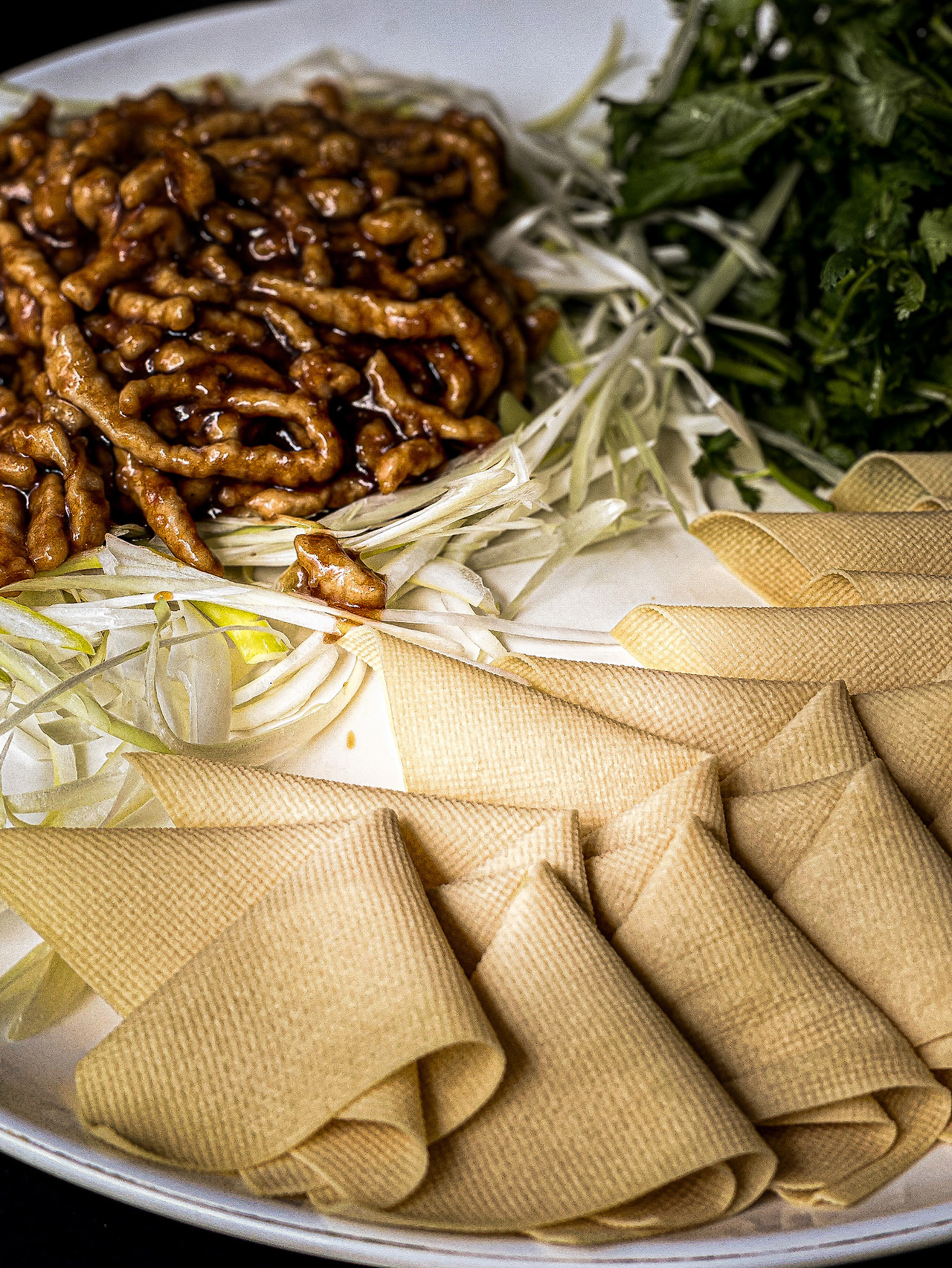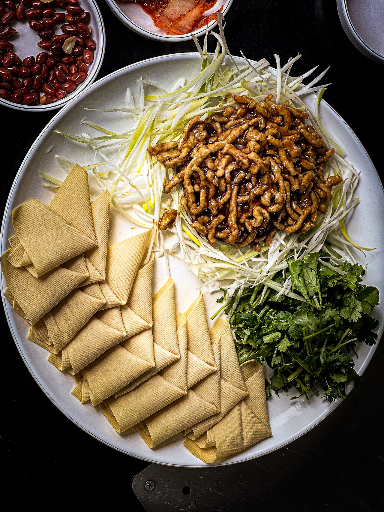 아주 많이라고 할 수는 없지만 때때로 가능하다면 [경장육슬]을 주문해, 얇게 썬 건두부(포두부라고도 한다), 신선한 야채를 아삭하게 먹는 것만큼 참을 수 없는 조합 위에 잘게 썰린 육류, 고수의 콜라보는 중국음식을 시작하기 전, 애피타이저로 손색이 없다. 식욕을 돋우는 건 물론이고, 배부르지만은 않아서 순서를 뒤바꿔 끝내기 아쉬울 때 끝으로 주문하는 경우도 더러 있었다. 물론 이런 방식은 베트남의 [월남쌈]처럼 제대로 먹으려면 품이 든다. 취향 따라 귀찮아할지 모르겠지만 간과할 수 없는 사실은 세팅된 [경장육슬]은 배달 주문으로 막 도착한 [퀘사디아] 같다는 점이다.