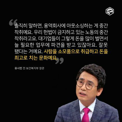 고 김용균 씨의 경우만 보더라도 발전소의 구조조정에 따른 인력 부족으로 2인 1 조 근무 원칙을 무시하고 1인 근무 체제로 돌아가고 있었고, 김용균 씨도 홀로 설비를 점검하다 변을 당하고 말았는데, 이렇게 노동자와 사용자 간 이루어져야 할 고용 중간에 개입에 노동자의 임금을 수수료 명목으로 떼어가고 원청 역시, 노동법과 사회보장법 상의 책임을 회피할 수 있는 수단으로 활용하는 용역제도를 왜 유지해만 하는지 유시민 작가의 일갈대로 뭔가 잘 못된 게 아닌가 싶습니다.