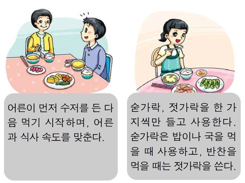 자료출처(김 톰슨 :: 식사예절 정리입니다 (tistory.com)이를테면 밥상 앞에서 어른이 숟가락을 들기 전에 먼저 숟가락을 들면 그건 어른에 대한 예의에 어긋난다고 말씀하셨다. 뿐만 아니라 어른이 진지를 다 잡수시기 전에 숟가락을 놓고 기다리거나 일어나서도 안되고 그래서 어른과 식사속도를 맞춰 끝내는 것이 올바른 '식사예절'이라고 말씀하셨다.